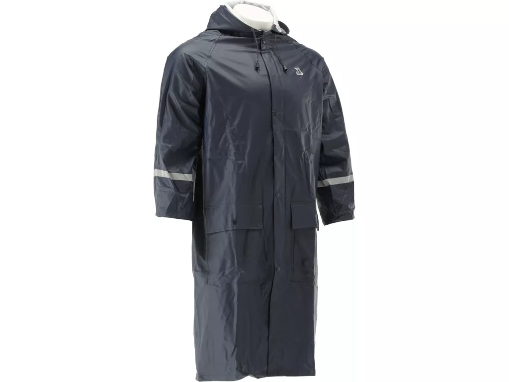 Rugalmas poliészter anyagból készült esőkabát PU bevonattal, amely vízlepergető hatást biztosít. Könnyű viseletet nyújt, és nem korlátozza a mozgást.