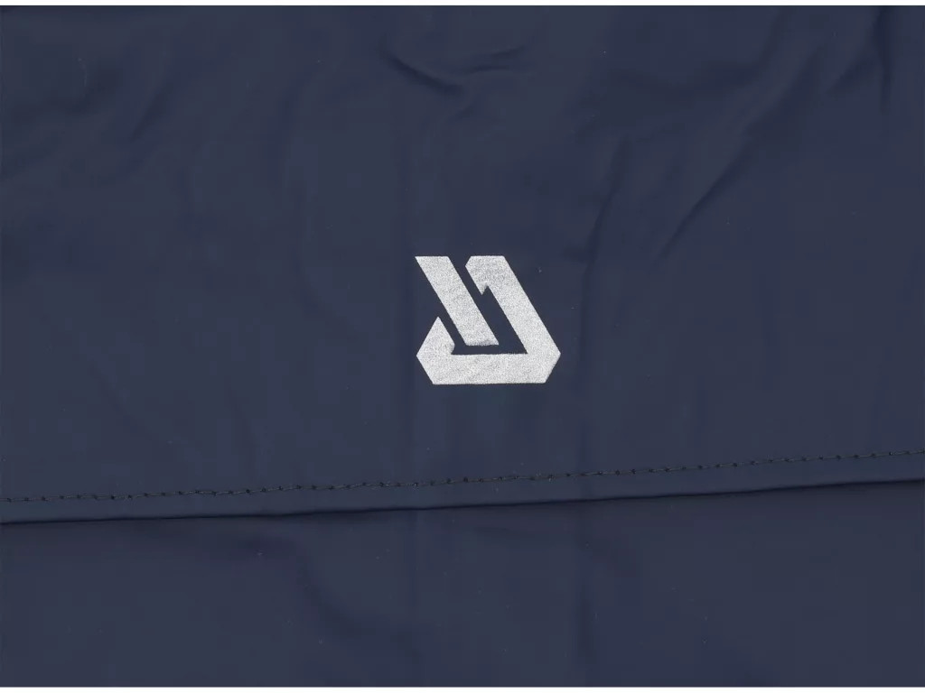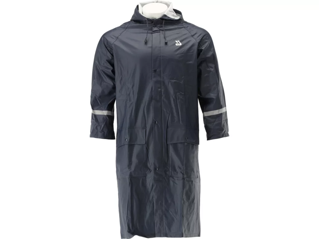 Rugalmas poliészter PU bevonatú esőkabát, vízálló és könnyű. Két nagy zseb patentfedéllel, zipzár fedve patkával. Rejtett kapucni állítható húzózsinórral, szélálló mandzsetták, hónalji ventillációs nyílások, hátoldali belső háló a légáteresztésért.