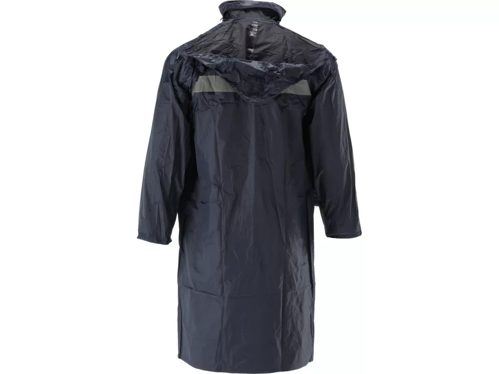 NAVY LIGHT esőkabát PVC-bevonatú poliészterből, vízálló; 2 nagy külső zseb fedéllel; cipzáras lezárás patentokkal; összehajtható kapucni cipzárral rögzíthető; hónalj alatti és hátsó szellőzők; navy szín, visszaverő csíkok; tasakos csomagolás; EU 2016/425 Category I.