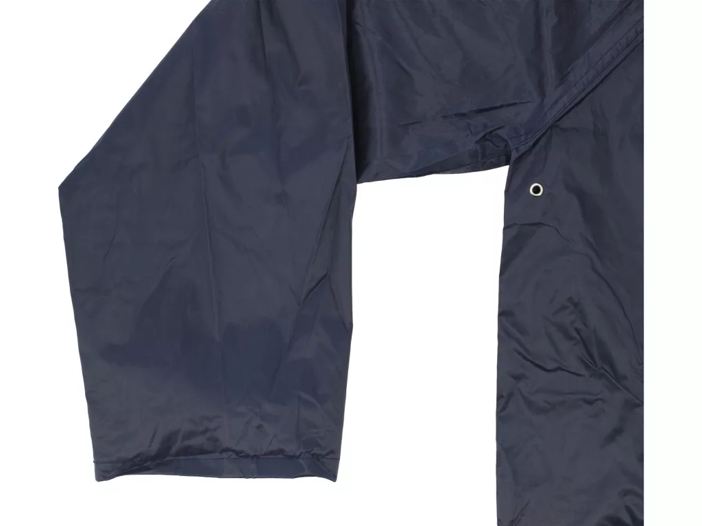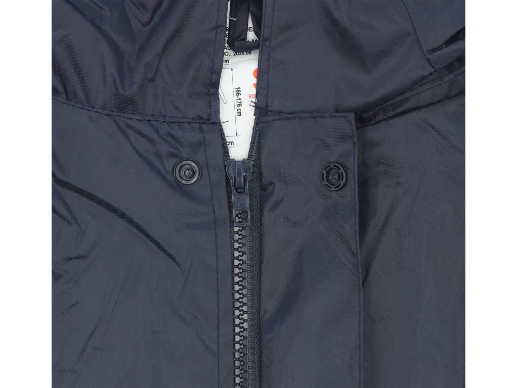NAVY LIGHT esőkabát PVC-bevonatú poliészterből, vízálló. Két külső zseb fedéllel, cipzár fedve patentokkal. Összehajtható kapucni, cipzárral rögzíthető. Hónalj- és hátsó szellőzőnyílások. Szín: sötétkék. Reflektív csíkok. Tasakos csomagolás. Megfelel EU 2016/425 I.