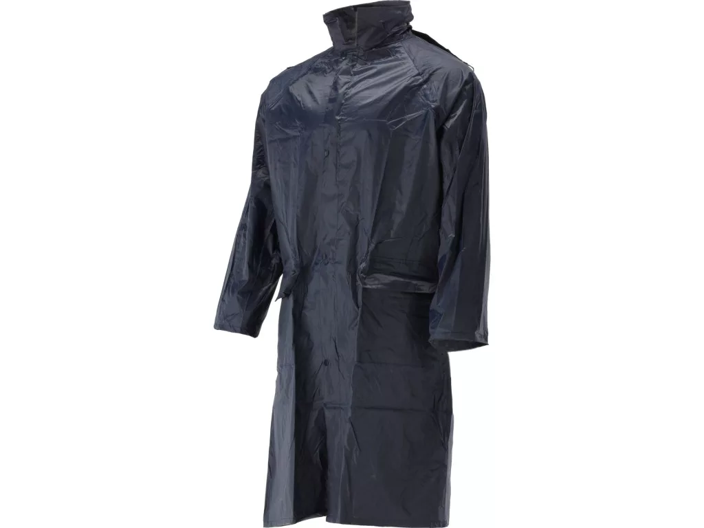 NAVY LIGHT sorozatú esőkabát PVC-bevonatú poliészterből, reflektív csíkokkal. Két külső zseb fedéllel, cipzáras zárás patentokkal. Összehajtható kapucni cipzárral rögzíthető. Ujjak belső elasztikus szegéllyel; hónalj- és hátsó szellőzőnyílások. Navy kék, tasakos csomagolás. Megfelel EU 2016/425 I. kategóriájú munkaruházatra.