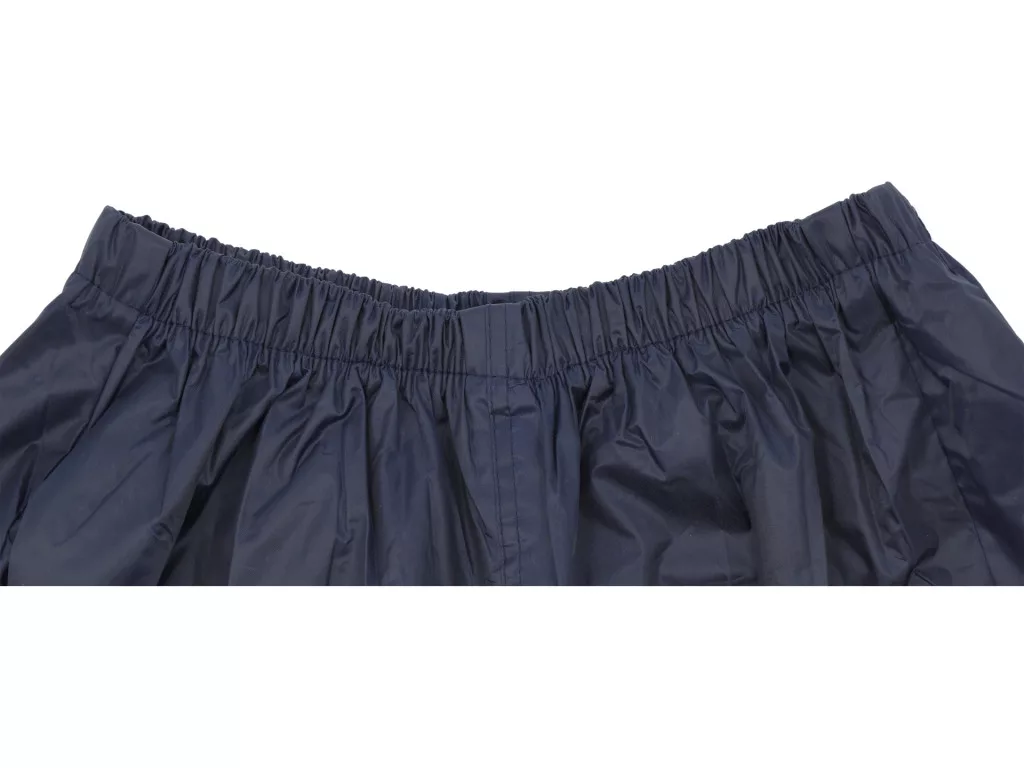 2 részes esőruha, PVC bevonatú 100% poliészter, fényvisszaverő csíkokkal. Kabát: két nagy zseb fedéllel, zipzárral, kapucni állítható, hónalj- és hátsó szellőzőnyílások, alul húzózsinórral. Nadrág: elasztikus derekú, alján zárás a szár szűkítéséhez. Kompakt tasakban.