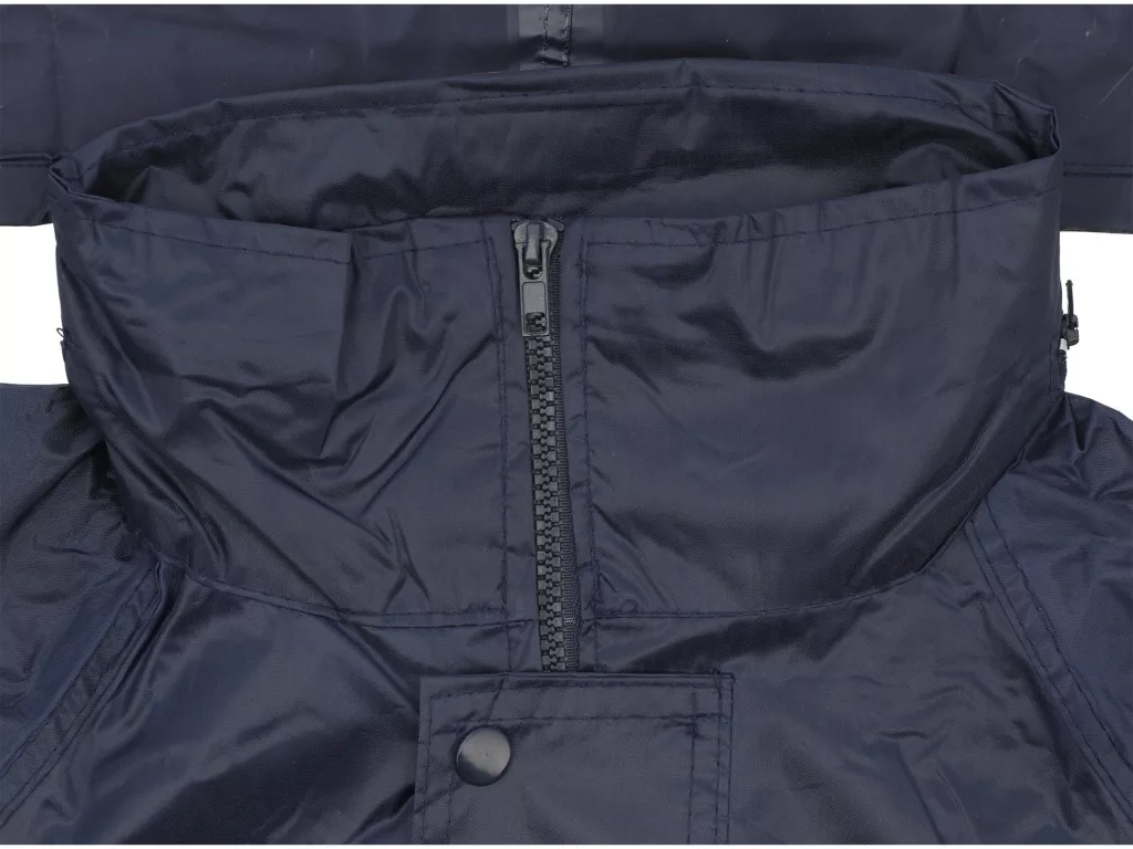 2 részes esőruha: 100% poliészter PVC bevonatú, vízálló, nem engedi a levegőt. Kabát: két nagy zseb, zipzár+patent, kapucni húzózsinórral, hónalji és hátsó szellőzőnyílások. Nadrág: elasztikus derék, oldalsó nyílások, alsó szár szűkítőzárral. Kompakt tasak.