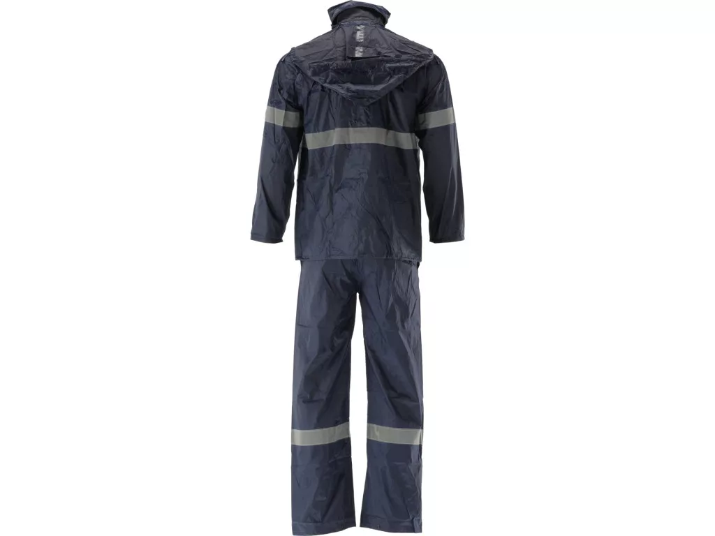 Két részes esőruha láthatóságot növelő fényvisszaverő sávokkal. A dzseki és a nadrág egyetlen készletben, amely teljesen vízálló és a levegő átáramlását nem teszi lehetővé a PVC bevonatú poliészter anyag miatt. A túlzott hő keletkezése a háton található szellőzőnyílások és a hónalji nyílások révén kerülhet ki, ami biztosítja a keletkező melegrész kijutását anélkül, hogy az eső bejutna a ruházatba.
