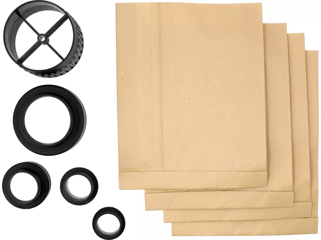 - Csomagolás tartalma: forgács- és porleválasztó készülék, 100 mm átmérőjű rugalmas tömlő, 2 tömlővég, szűrő, szűrőzsák, adapter a szerszám csatlakoztatásához