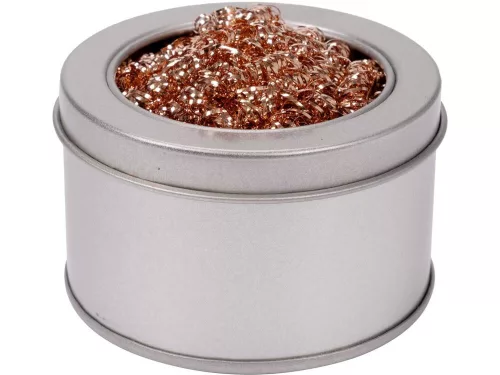 YT-82510 Forrasztópákahegy tisztító, amely sárgaréz forgácsból készült, és egy lyukas fedelű fémdobozban van elhelyezve.