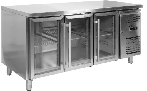 Élelmiszertároló üveges hűtőasztal oldalsó egységgel és dupla edzett üvegajtókkal. Külső és belső burkolat kiváló minőségű 201-es rozsdamentes acélból. Jellemzői: kényelmes, csavaros fogantyúk az ajtók nyitásához, statikus hűtés ventilátoros kényszerkeringtetéssel, automatikus leolvasztás, elektronikus vezérlő digitális kijelzővel, 10 fokozatban állítható polcmagasság, önzáró ajtók, cserélhető mágneses tömítések.