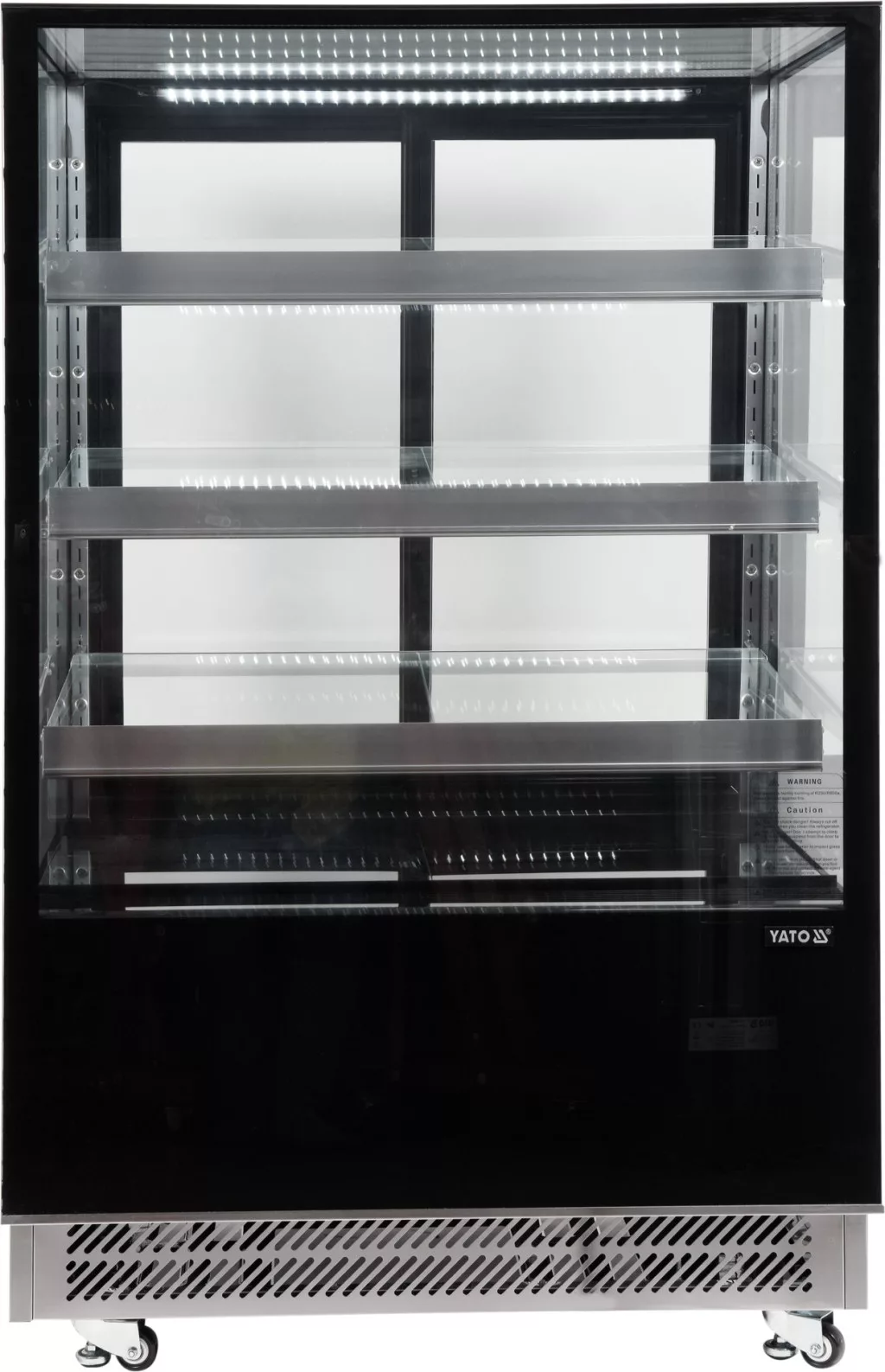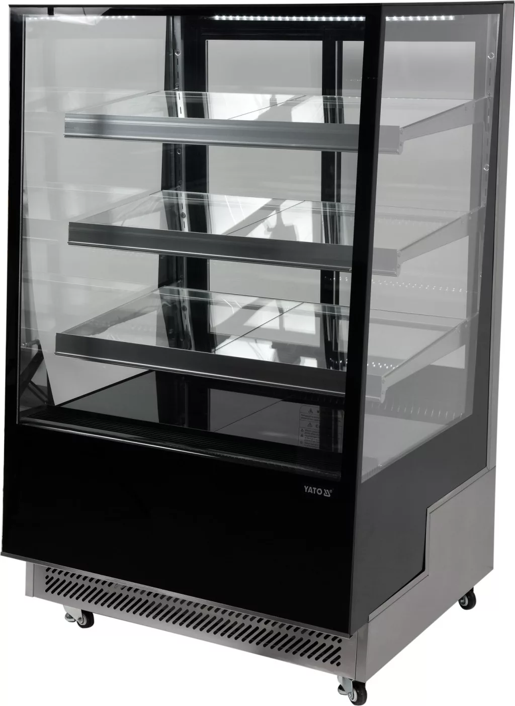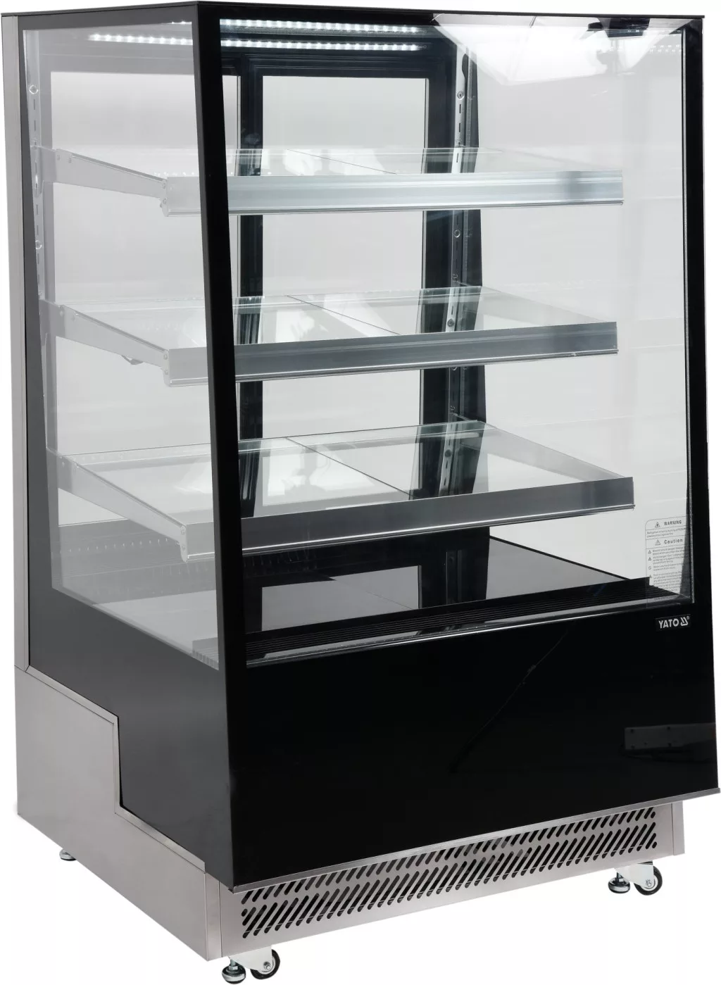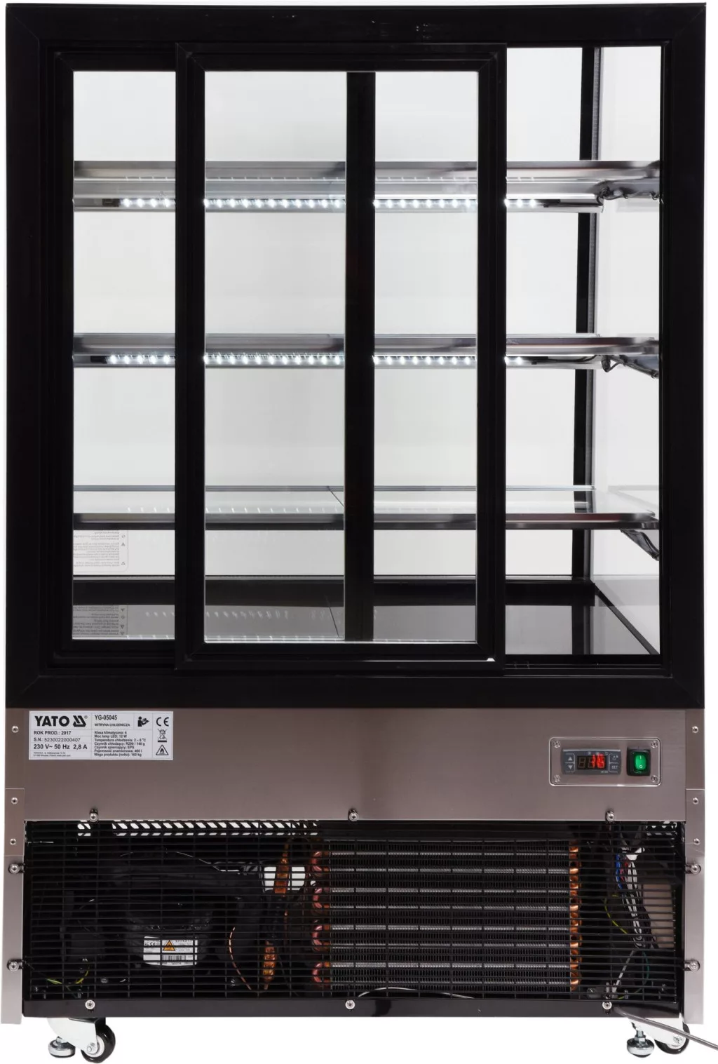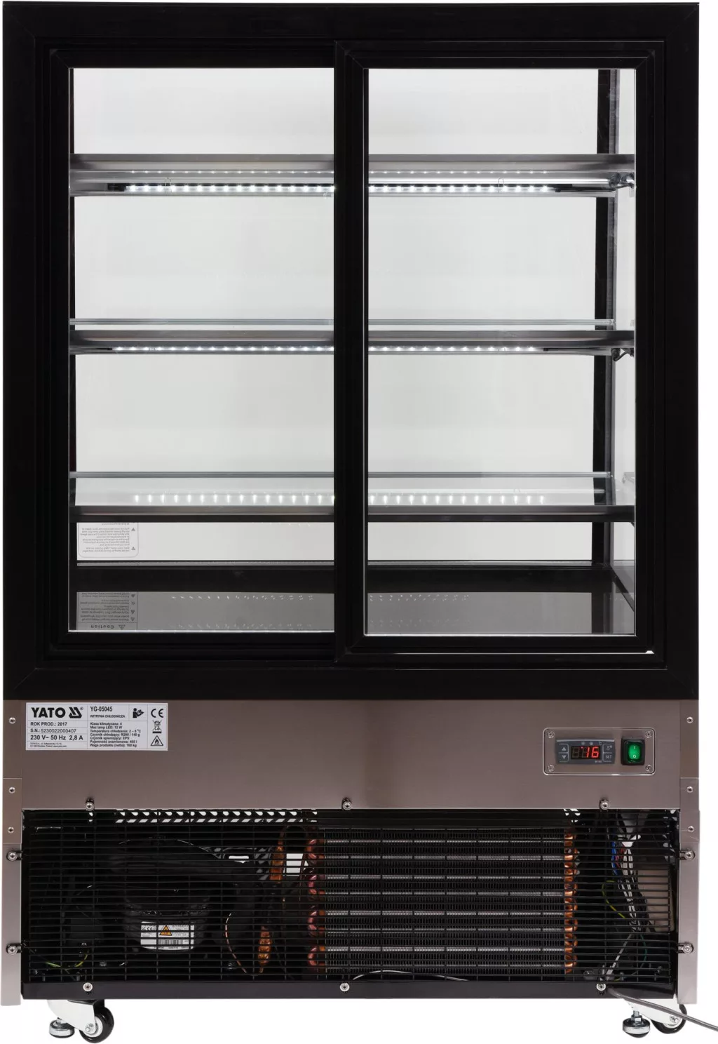 A modern dizájn a kiváló minőségű alapanyagokkal kombinálva a YATO hűtött vitrint minden típusú cukrászdában, kávézóban, étteremben és kiskereskedelmi üzletben remekül fest. Ezenkívül az egyes polcok aljára szerelt LED-es világítás nagyon vonzó módon jeleníti meg a bemutatott ételeket, ösztönözve a vásárlókat azok kiválasztására. A YATO hűtővitrin 400 literes űrtartalmú és három üvegpolccal rendelkezik, állítható beépítési magassággal. Nyíló üvegajtókon keresztül érhetők el. Kétrétegű edzett üvegből készülnek, akárcsak az első és oldalsó ablakok. Ez biztosítja a nagy tartósságot és egyben nagyon jó szigetelő tulajdonságokat. A vitrin +2-+8°C hőmérsékleti tartományban működik R290 hűtőközeggel. A keringetős levegős hűtési technológia és az automatikus leolvasztó funkció azonban nagyon hatékony működést és energiatakarékosságot biztosít. Ezenkívül a keringető hűtés garantálja a levegő egyenletes eloszlását a teljes vitrinben, egyenlő hőmérsékletet biztosítva minden polcon. Az átlagos éves energiafogyasztás 2809 kWh.