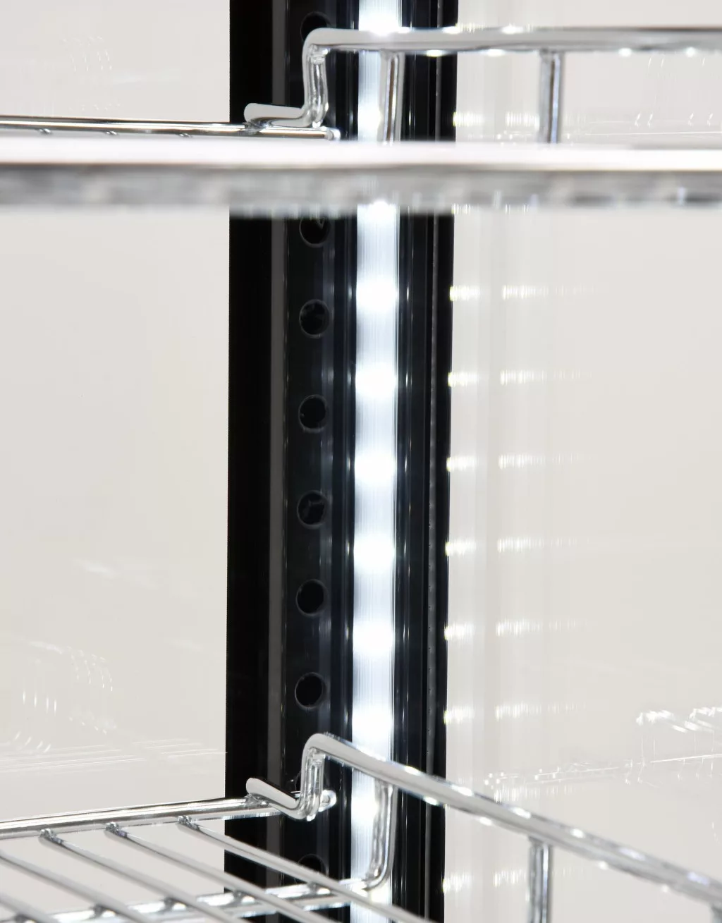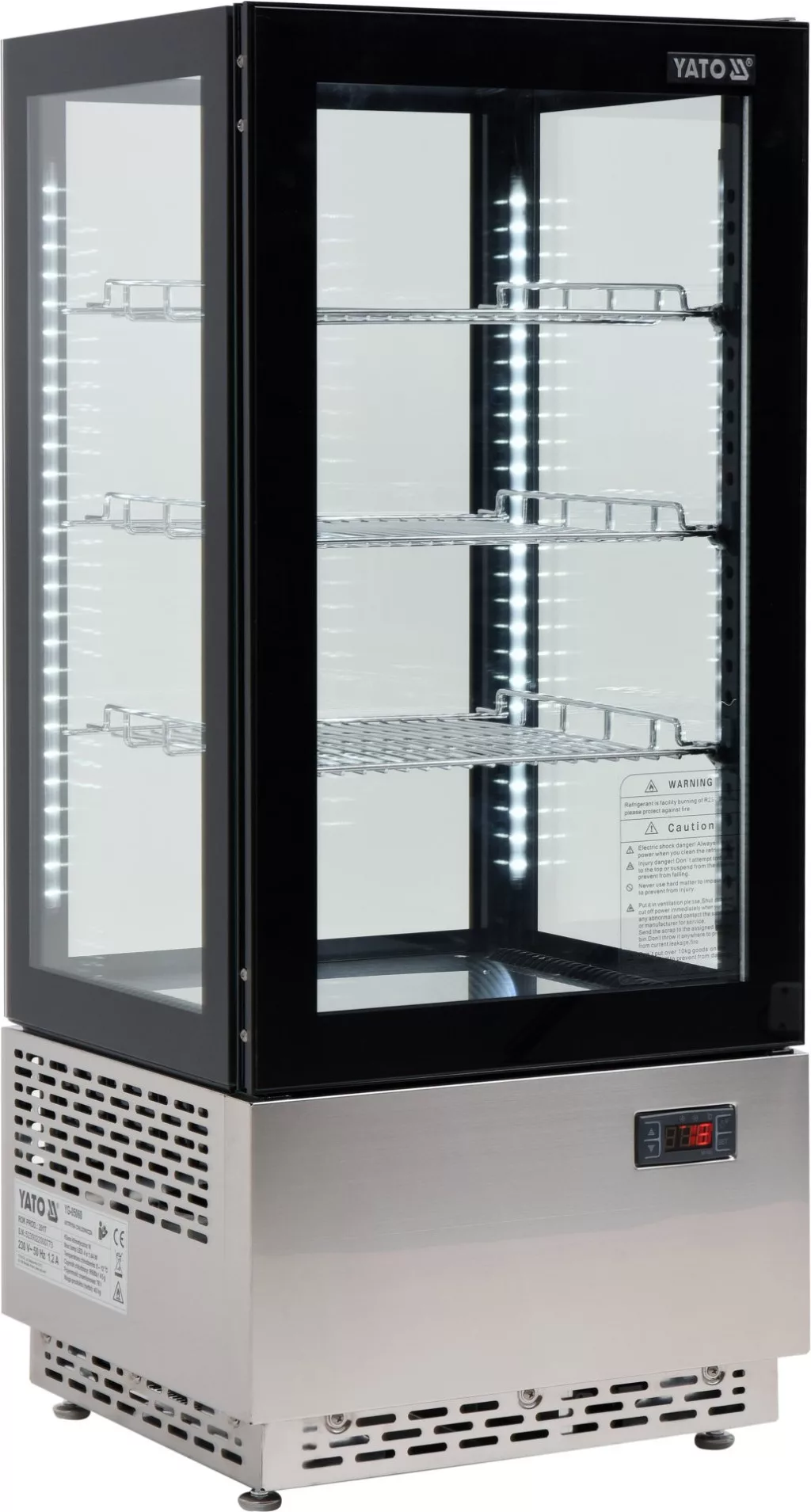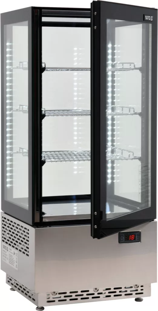 A modern dizájn a kiváló minőségű alapanyagokkal kombinálva a YATO hűtött vitrint minden típusú cukrászdában, kávézóban, étteremben és kiskereskedelmi üzletben remekül fest. Ezenkívül az egyes polcok aljára szerelt LED-es világítás nagyon vonzó módon jeleníti meg a bemutatott ételeket, ösztönözve a vásárlókat azok kiválasztására. A YATO hűtővitrin 78 literes űrtartalmú és három üvegpolccal rendelkezik, állítható beépítési magassággal. Nyíló üvegajtókon keresztül érhetők el. Kétrétegű edzett üvegből készülnek, akárcsak az első és oldalsó ablakok. Ez biztosítja a nagy tartósságot és egyben nagyon jó szigetelő tulajdonságokat. A vitrin +2-+8°C hőmérsékleti tartományban működik R290 hűtőközeggel. A keringetős levegős hűtési technológia és az automatikus leolvasztó funkció azonban nagyon hatékony működést és energiatakarékosságot biztosít. Ezenkívül a keringető hűtés garantálja a levegő egyenletes eloszlását a teljes vitrinben, egyenlő hőmérsékletet biztosítva minden polcon. Az átlagos éves energiafogyasztás 1074 kWh.