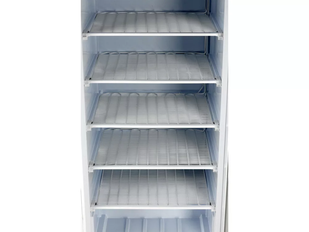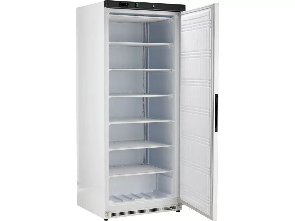 Fagyasztószekrény, kiváló minőségű, fehér színű lakkozott acélból készült, elektronikus vezérlővel és digitális kijelzővel felszerelt, önzáródó és zárral ellátott ajtóval.