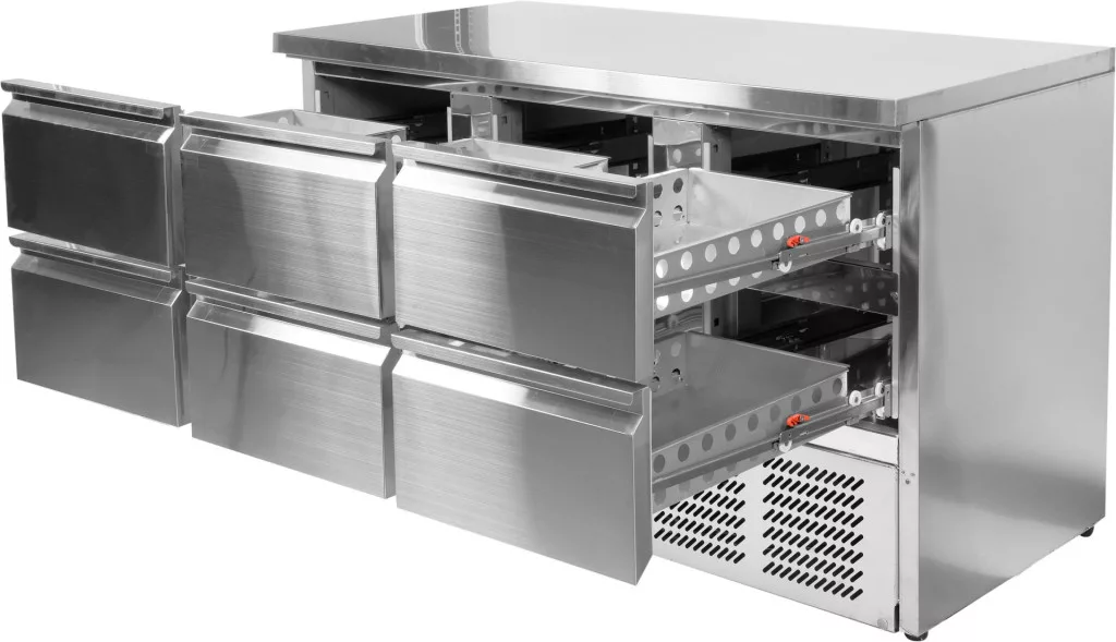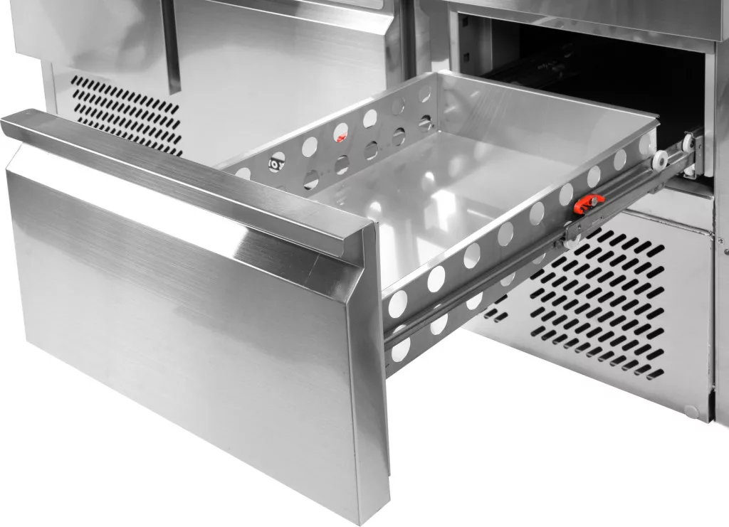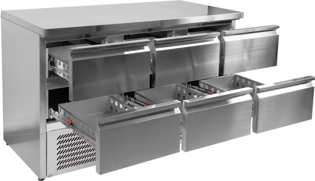 Lehetővé teszik a GN 1/1 méretű , legfeljebb 155 mm magas tartályok és palackok tárolását. A fiókok oldalfalán lévő nyílások szabad levegőáramlást tesznek lehetővé, növelve a hűtési hatékonyságot. A fiókok golyóscsapágyas vezetőkre vannak felszerelve , és speciális kialakításuk lehetővé teszi a mosáshoz való teljes kihúzást és eltávolítást , ami nagyban megkönnyíti a tárolt termékek elérését. A cserélhető mágneses tömítések biztosítják a szoros zárást. A kiváló minőségű SS201 rozsdamentes acélból készült külső és belső burkolat elegáns megjelenést garantál. A belső kamra lekerekített élei nagyon egyszerűvé teszik a tisztán tartást. A 240 W teljesítményű alsó hűtőegység R290 hűtőközeget használ, amely a 4-es klímaosztályban működik , maximum 30℃ környezeti hőmérséklettel és 55%-os relatív páratartalommal. Az átlagos éves energiafogyasztás 1797 kWh . 220-240V ~ 50Hz feszültségről működik . A készülék ventilátoros hűtéssel és automatikus leolvasztó funkcióval rendelkezik. Dixell elektronikus vezérlő digitális hőmérséklet kijelzővel.
