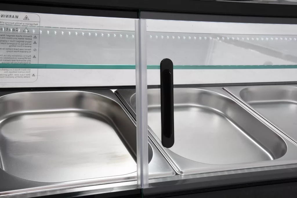 YATO 5x1/2GN hűtővitrinje sushi, tapas és különféle előételek bemutatására szolgál. A modern dizájn és a kiváló minőségű alapanyagok kombinálva a YATO hűtővitrint minden típusú étteremben és szállodában remekül mutat. Emellett a beépített LED-es világítás nagyon vonzóan emeli ki a bemutatott ételeket, és arra ösztönzi a vásárlókat, hogy azok közül válasszanak. A YATO hűtőbővítőbe 5 db 5x1/2GN-es rozsdamentes acél konténer fér, melyeket a készlet tartalmazza. Az üveg tolóajtókon keresztül közelíthető meg. Edzett üvegből készülnek, akárcsak a lekerekített panorámás szélvédő. Ez biztosítja a nagy tartósságot és egyben nagyon jó szigetelő tulajdonságokat. A vitrin 0-+12°C hőmérséklet-tartományban működik R600a hűtőközeggel. A felső gőzfúvókával és az automatikus leolvasztó funkcióval ellátott statikus hűtési technológia azonban nagyon hatékony működést biztosít, és egyben energiatakarékos. Az átlagos éves energiafogyasztás 955 kWh.