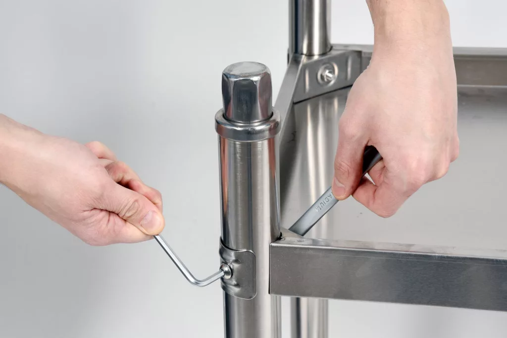 A polcos asztal kiváló minőségű SS201 rozsdamentes acélból készült, intenzív használat mellett gasztronómiai használatra is alkalmas. A gondosan elkészített hegesztett kötések és a sima felületek nagyon egyszerűvé teszik a tisztán tartást. Az asztallap masszív, 0,8 mm vastag fémlemezből készült, további erősítő profilokkal. Ezenkívül a teteje alulról 20 mm vastag laminált falappal van megerősítve, amely merevíti és ellenáll a nedvességnek. Ennek köszönhetően az asztallap akár 150 kg-os teherbírást is elérhet. Ezenkívül a mellékelt alsó polc nagyon funkcionális, és lehetővé teszi a munkaterület teljes kihasználását.Az asztallap hátul további 100 mm magas éllel rendelkezik , aminek köszönhetően, ha az asztalt a falhoz helyezzük, megakadályozza, hogy az ételmaradékok az asztal mögé kerüljenek, jelentősen növelve a munkahigiéniát. Akár 35 kg-os teherbírása lehetővé teszi a praktikus edények és eszközök tárolását. A kerek profilokból készült asztallábak magassága +/-15mm tartományban állítható, ami lehetővé teszi az asztal egyenetlen felületeken is vízszintbe állítását. Ezenkívül műanyag betétekkel rendelkeznek, amelyek megvédik a padlót a karcolásoktól. A YATO asztal nagyon fontos előnye az alkalmazott csavaró rendszer. A szétszedhető asztal egy kis dobozba is elfér, így a szállítási költsége viszonylag alacsony. A raktárban is kevés helyet foglal. Az asztal összeszerelése azonban nagyon gyors és egyszerű. Az alkalmazott megoldások nagyon stabil szerkezetet garantálnak.