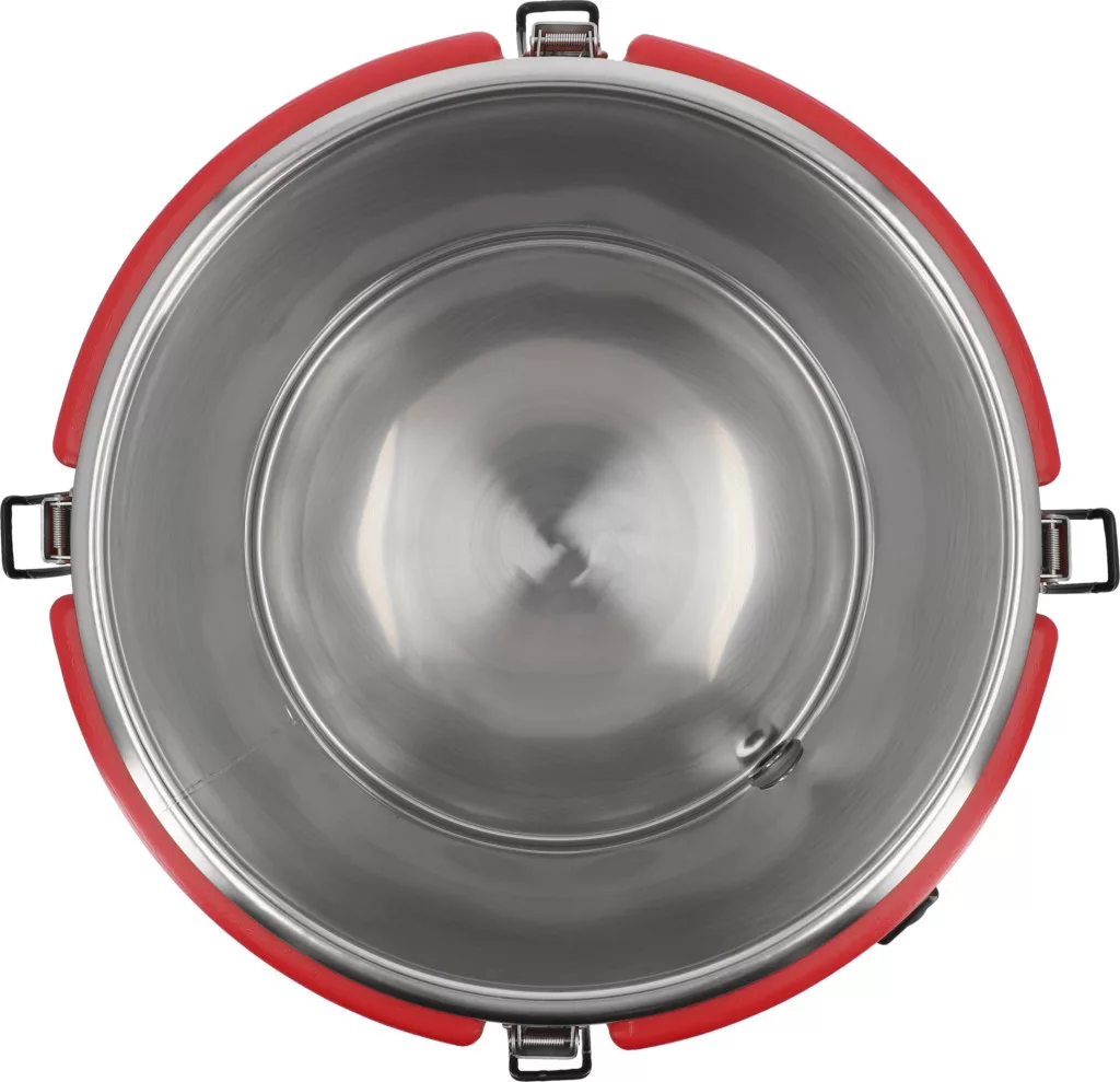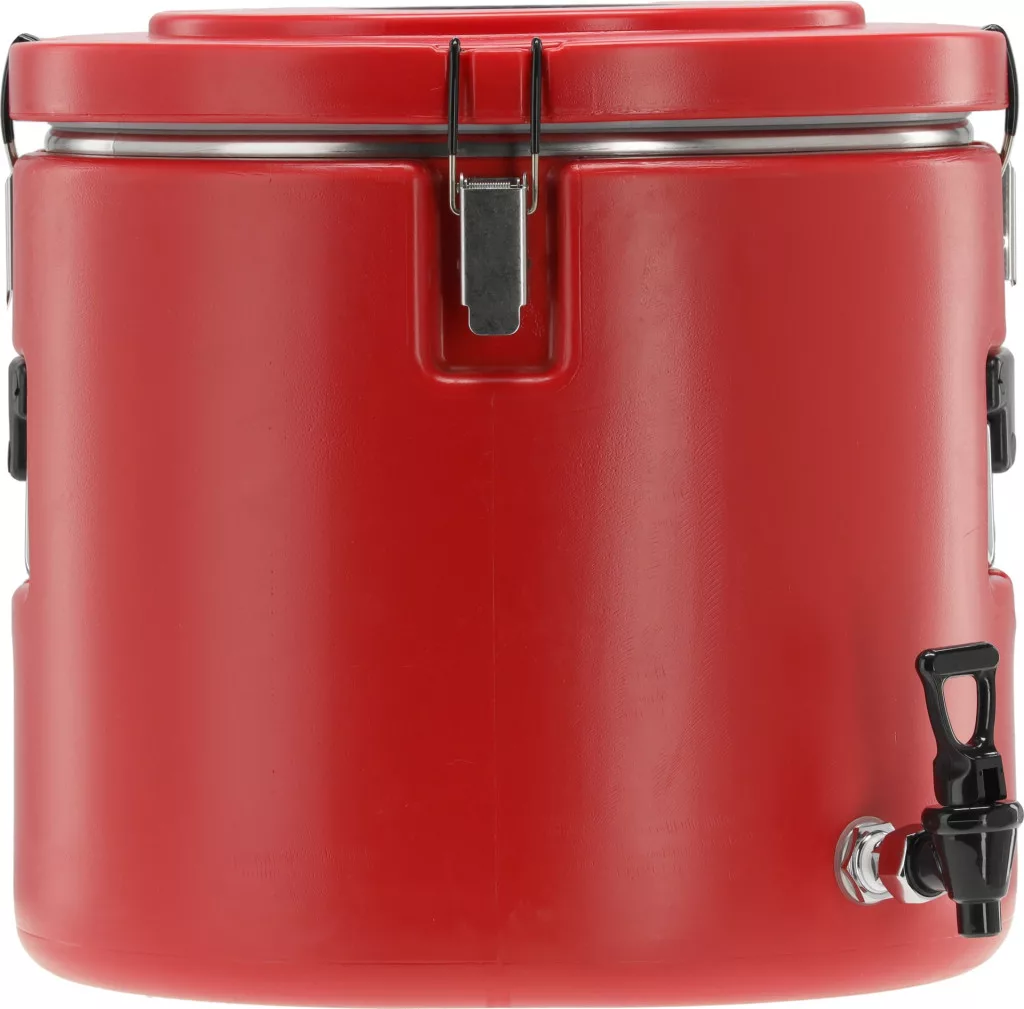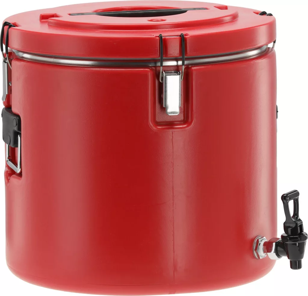 Vendéglátóipari izotermikus tartály csapteleppel. Kiváló minőségű polietilénből készült, amely a kezelés és szállítás során karcolás- és horpadásálló. A tartály belseje kiváló minőségű rozsdamentes acélból készült, könnyen tisztítható és ellenáll a szerves savaknak.