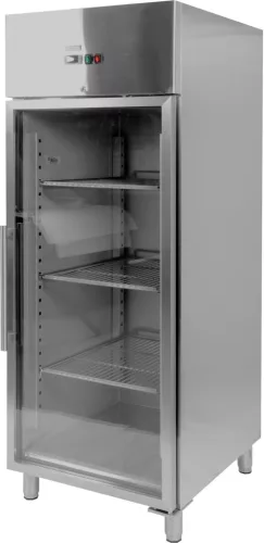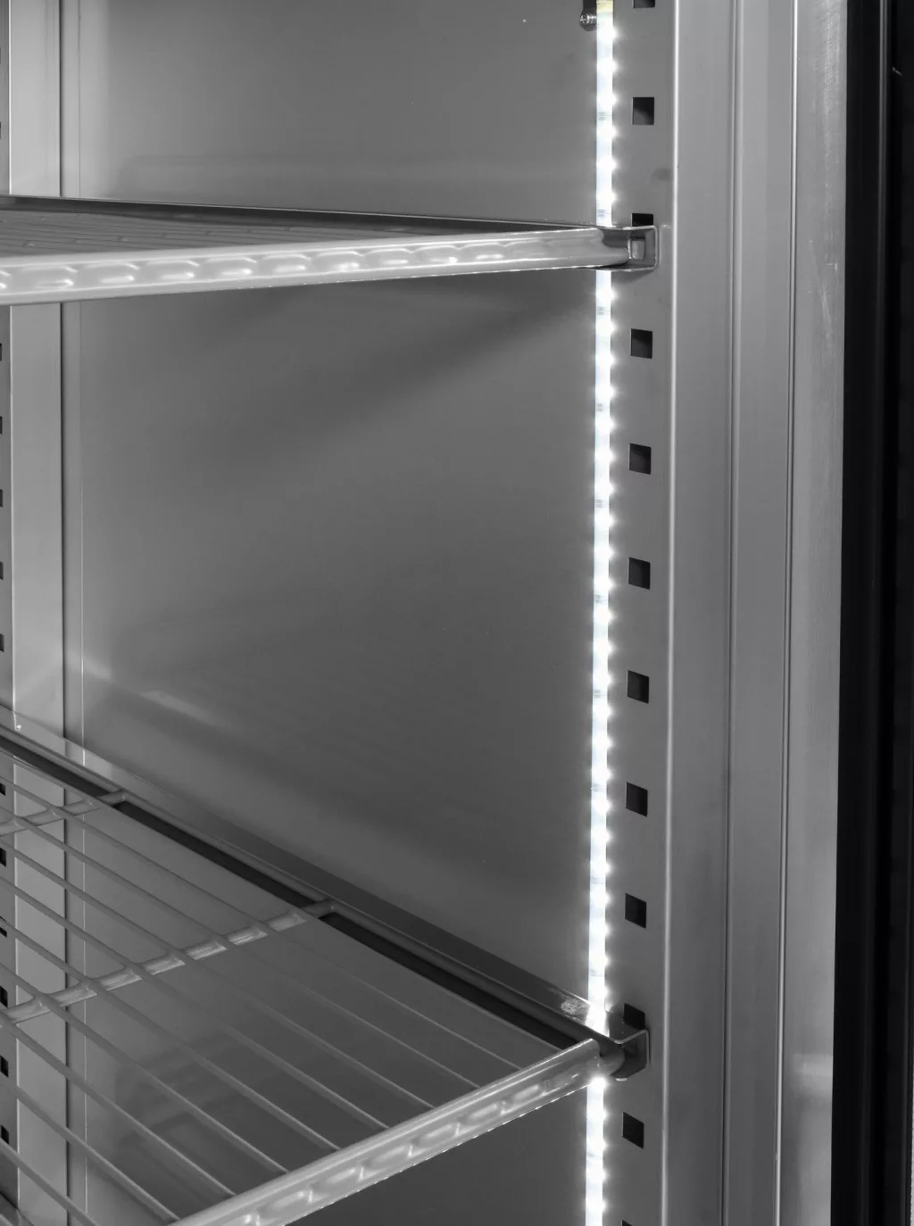 Külső és belső burkolat kiváló minőségű 201-es rozsdamentes acélból. Jellemzői: ventilátoros hűtés kényszerkeringtetéssel, automatikus leolvasztás, elektronikus vezérlő digitális kijelzővel, nagy és kényelmes fogantyú az ajtónyitáshoz, állítható lábak 140-200 mm tartományban