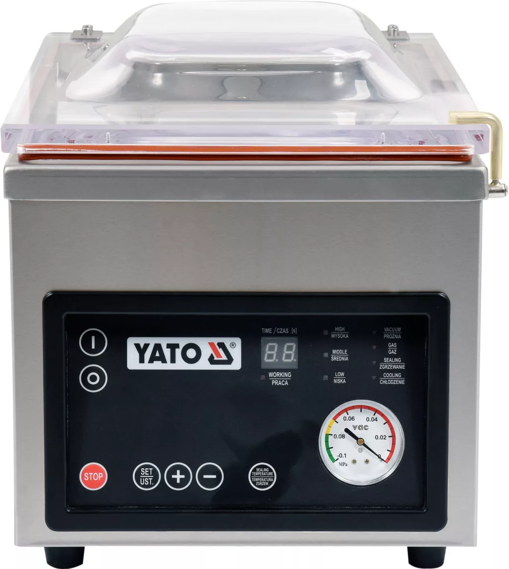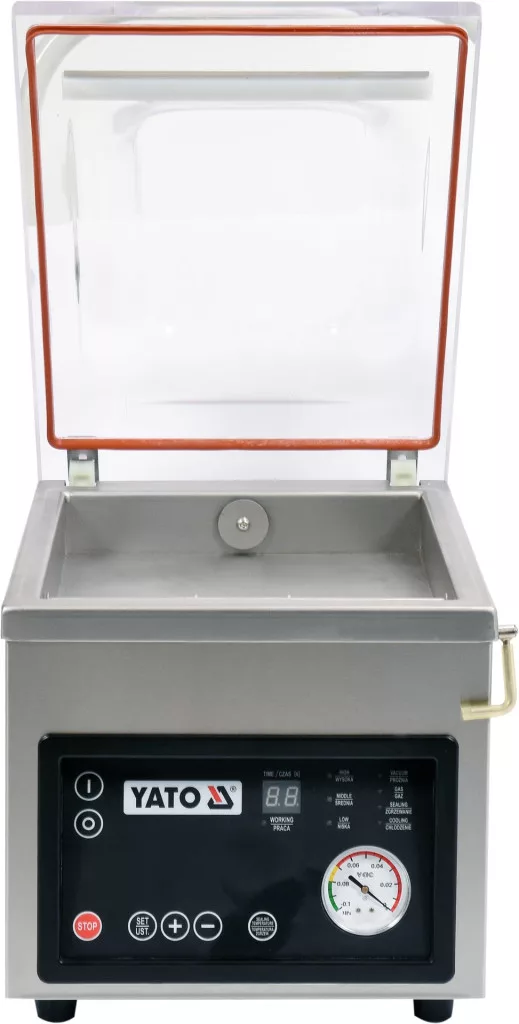 A kamrás vákuumcsomagoló gép nagyon hasznos eszköz minden vendéglátó egységben. Lehetővé teszi az élelmiszerek vákuumcsomagolását, amely oxigén nélkül sokkal tovább friss marad. Az így becsomagolt termékek a hűtőszekrényben-fagyasztóban nagyon hosszú ideig tárolhatók. A legjobb minőségű, akár 10m3/h kapacitású szivattyú és az akár 260mm széles tömítőrúd lehetővé teszi még nagy zsákok nagyon gyors bepakolását is. A teljesen automatikus csomagolási folyamat és a lezárási idő beállításának lehetősége sokkal könnyebbé és gyorsabbá teszi a munkát. A beépített digitális kijelző és nyomásjelző azonban jól látható, és teljes ellenőrzést biztosít a teljes csomagolási folyamat felett. A YATO márkájú vákuumcsomagoló gép a legjobb minőségű alapanyagokból készül. A 385x280x50(100) méretű vákuumkamra vastag és masszív rozsdamentes acélból készül, ami nagyon hosszú élettartamot garantál. A lekerekített formák megkönnyítik a tisztán tartást. A csomagológép burkolata nagyon tömör műanyagból készült, átlátszó színben. Ez lehetővé teszi a csomagolási folyamat nyomon követését és teljes ellenőrzését. Ezenkívül a fedélnek van egy bemélyedése, amely 50 mm-ről 100 mm-re növeli a kamra magasságát, lehetővé téve nagyobb termékek csomagolását. A 480x330x375mm külső méretű YATO állítható csomagológép súlya 33kg, így bárhol elhelyezhető. A készülék teljesítménye 370W, tápellátása pedig 230V ~ 50Hz.