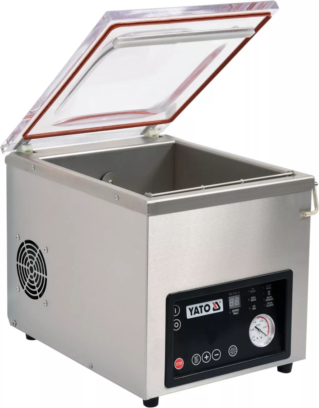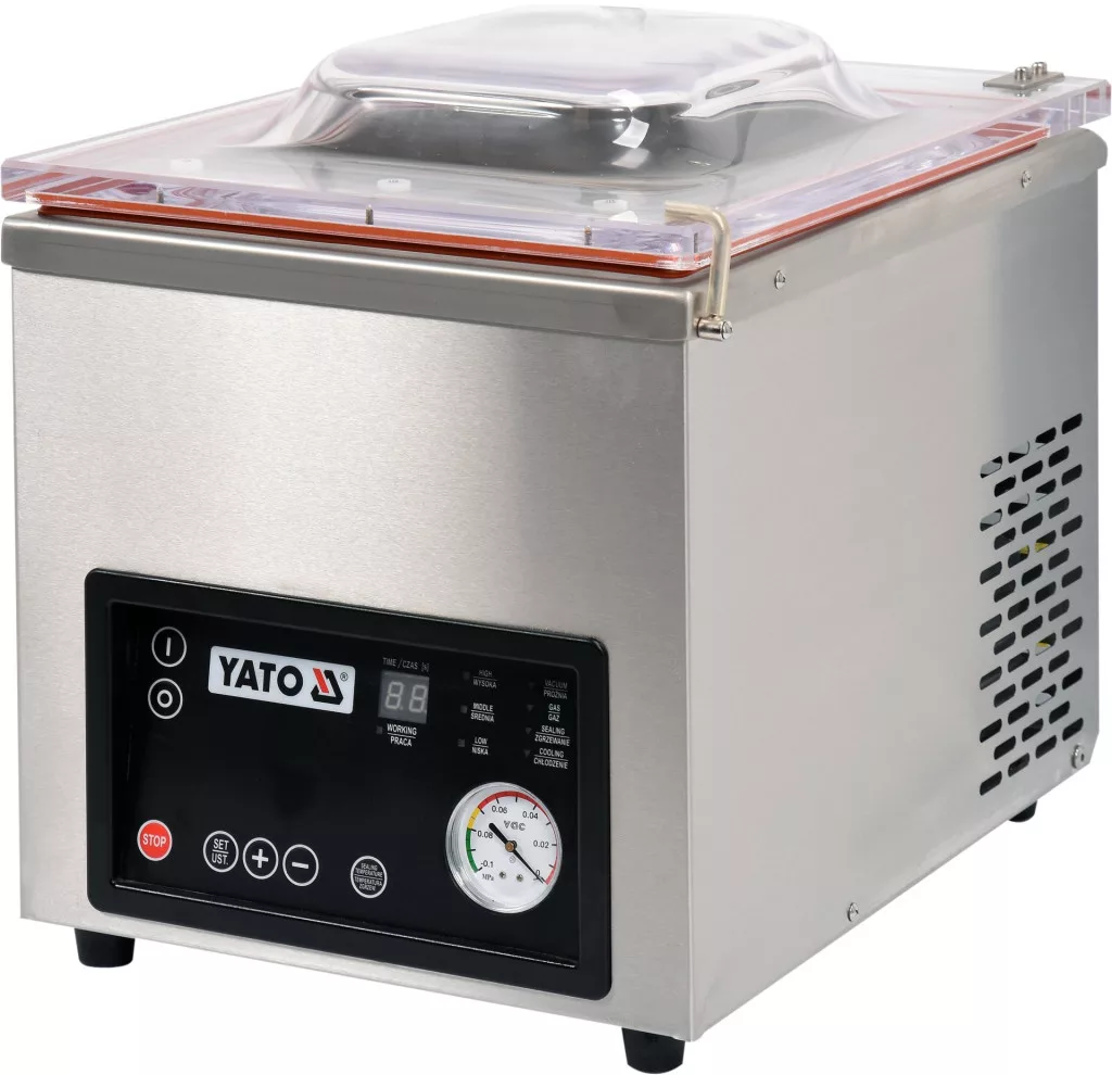 A kamrás vákuumcsomagoló gép nagyon hasznos eszköz minden vendéglátó egységben. Lehetővé teszi az élelmiszerek vákuumcsomagolását, amely oxigén nélkül sokkal tovább friss marad. Az így becsomagolt termékek a hűtőszekrényben-fagyasztóban nagyon hosszú ideig tárolhatók. A legjobb minőségű, akár 10m3/h kapacitású szivattyú és az akár 300 mm széles tömítőrúd lehetővé teszi még nagy zsákok nagyon gyors bepakolását is. A teljesen automatikus csomagolási folyamat és a lezárási idő beállításának lehetősége sokkal könnyebbé és gyorsabbá teszi a munkát. A beépített digitális kijelző és nyomásjelző azonban jól látható, és teljes ellenőrzést biztosít a teljes csomagolási folyamat felett. A YATO márkájú vákuumcsomagoló gép a legjobb minőségű alapanyagokból készül. A 370x320x135 (185) mm méretű vákuumkamra vastag és masszív rozsdamentes acélból készül, ami nagyon hosszú élettartamot garantál. A lekerekített formák megkönnyítik a tisztán tartást. A csomagológép burkolata nagyon tömör műanyagból készült, átlátszó színben. Ez lehetővé teszi a csomagolási folyamat nyomon követését és teljes ellenőrzését. Ezenkívül a fedélnek van egy bemélyedése, amely 135 mm-ről 185 mm-re növeli a kamra magasságát, lehetővé téve nagyobb termékek csomagolását. A 480x370x450 mm külső méretű YATO állítható csomagológép súlya 39 kg, így bárhol elhelyezhető. A készülék teljesítménye 370W, tápellátása pedig 230V ~ 50Hz.