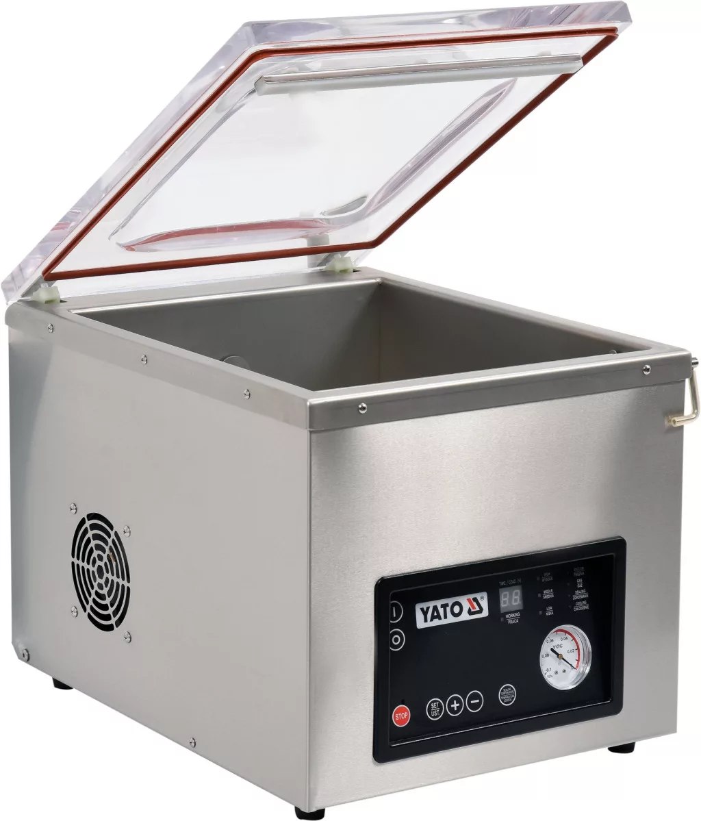 A kamrás vákuumcsomagoló gép nagyon hasznos eszköz minden vendéglátó egységben. Lehetővé teszi az élelmiszerek vákuumcsomagolását, amely oxigén nélkül sokkal tovább friss marad. Az így becsomagolt termékek a hűtőszekrényben-fagyasztóban nagyon hosszú ideig tárolhatók. A legjobb minőségű, akár 20m3/h kapacitású szivattyú és az akár 350 mm széles tömítőrúd lehetővé teszi még nagy zsákok nagyon gyors bepakolását is. A teljesen automatikus csomagolási folyamat és a lezárási idő beállításának lehetősége sokkal könnyebbé és gyorsabbá teszi a munkát. A beépített digitális kijelző és nyomásjelző azonban jól látható, és teljes ellenőrzést biztosít a teljes csomagolási folyamat felett. A YATO márkájú vákuumcsomagoló gép a legjobb minőségű alapanyagokból készül. A 450x370x170 (220) mm méretű vákuumkamra vastag és masszív rozsdamentes acélból készül, ami nagyon hosszú élettartamot garantál. A lekerekített formák megkönnyítik a tisztán tartást. A csomagológép burkolata nagyon tömör műanyagból készült, átlátszó színben. Ez lehetővé teszi a csomagolási folyamat nyomon követését és teljes ellenőrzését. Ezenkívül a fedélnek van egy bemélyedése, amely 170 mm-ről 220 mm-re növeli a kamra magasságát, lehetővé téve nagyobb termékek csomagolását. A 560x425x490 mm külső méretű YATO állítható csomagológép súlya 58 kg, így bárhol elhelyezhető. A készülék teljesítménye 900W, tápellátása pedig 230V ~ 50Hz.