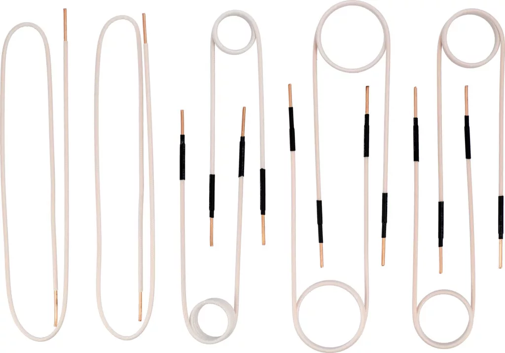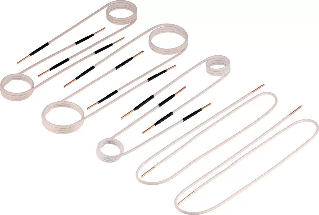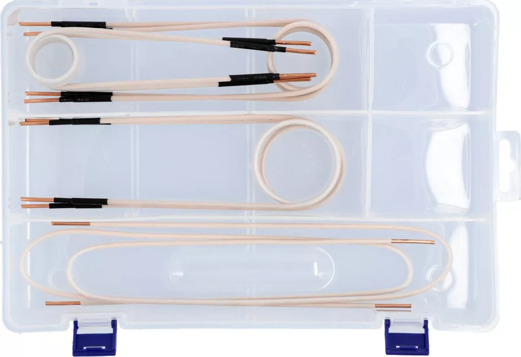 Készlet tartalma: fűtőtekercs x6 (Ø 30 mm x2, Ø 40 mm x2, Ø 50 mm x2), fűtőkábel x2 (L=750 mm)