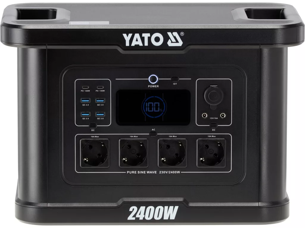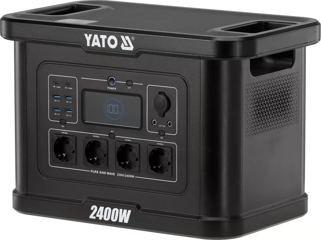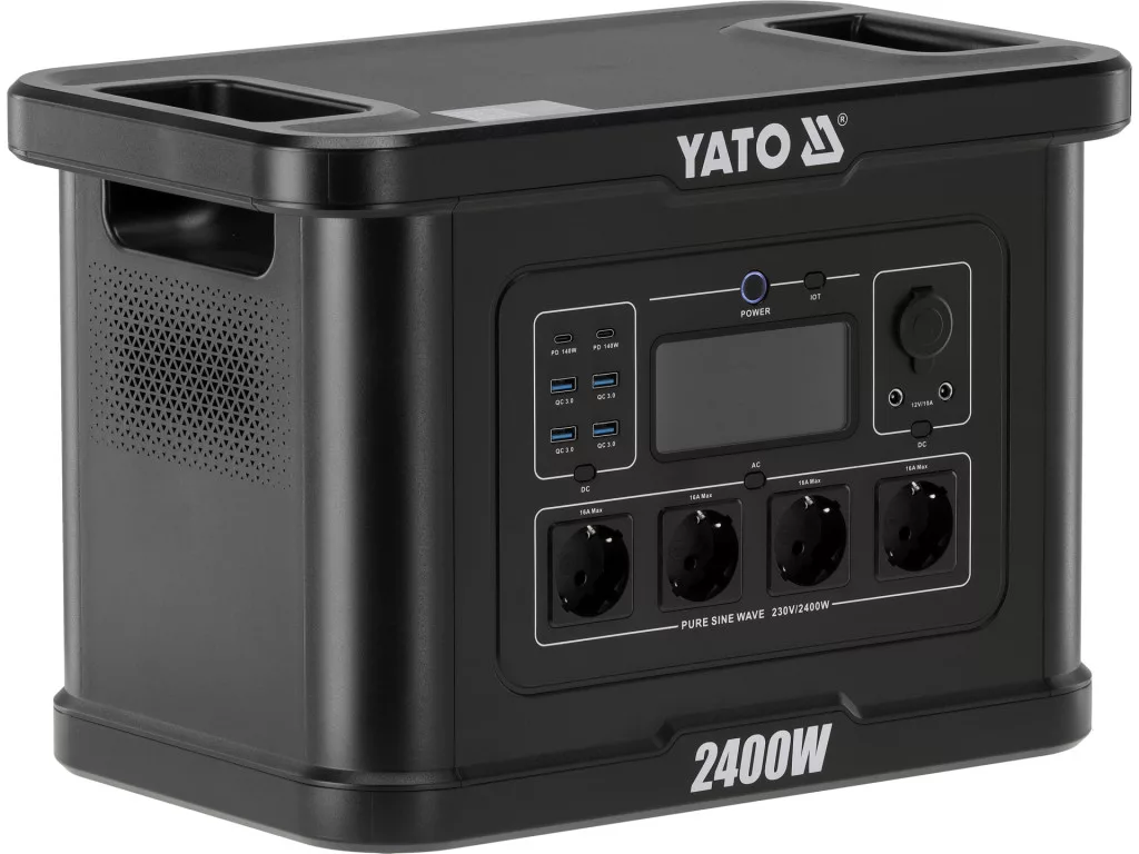 YATO hordozható energiaállomás, 2232 Wh LiFePO4 akkumulátor, 2400 W AC teljesítmény, EPS vészüzem, AC/DC/USB kimenetek, 20 ms automatikus átkapcsolás, mobil és otthoni energiaellátásra.