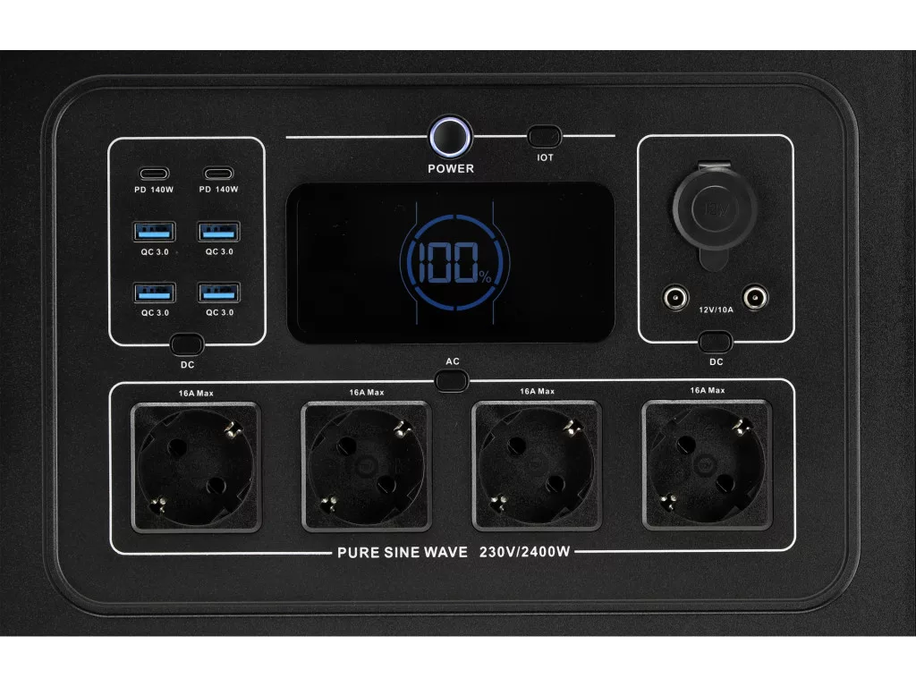 - 4 AC hálózati aljzat 230 V (EU), 2 DC 12 V kimenet, 12 V / 10 A autóaljzat, 4 USB-A, 2 USB-C (Power Delivery) - a laptopokhoz, tabletekhez és okostelefonokhoz