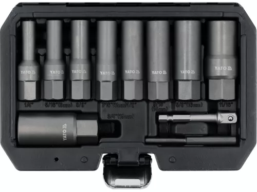 Hosszú kihúzókészlet csavarokhoz, beragadt, letört és mélyen ülő rögzítőelemek eltávolítására, 11 darabos, 3/8 meghajtású, 90 mm hosszú tengellyel, HEX adapterrel, tokban.