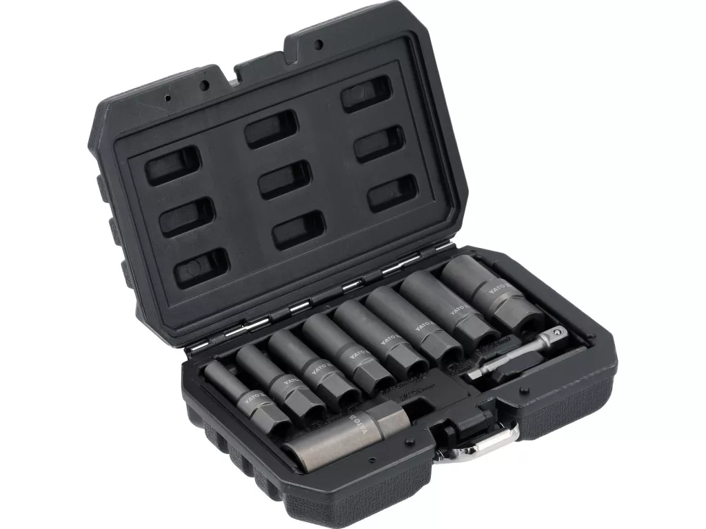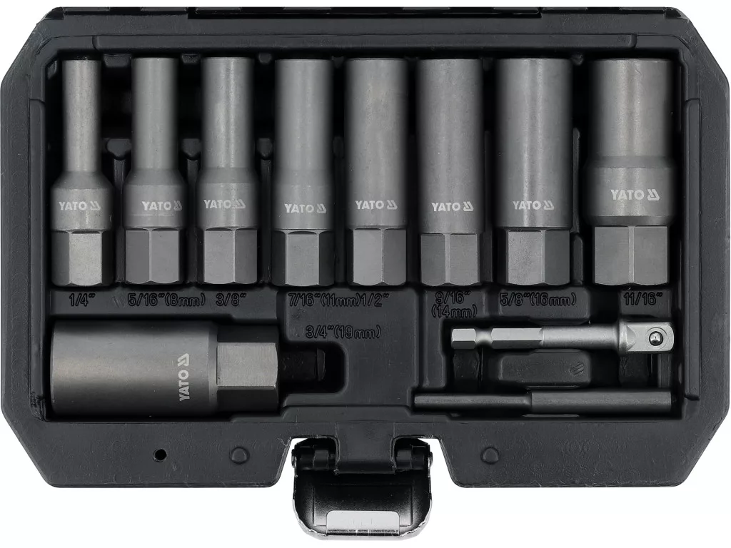 A készlet a 3/8" (9,5 mm) racsnihoz és 3/8" dugókulcsokhoz való használatra készült, stabil forgatónyomaték-átvitelt biztosítva. A hosszú kihúzók lehetővé teszik a hozzáférést a mélyen elhelyezkedő csavarokhoz, csapokhoz és tengelyekhez a mély belső foglalatokban, burkolatokban és szerkezeti elemekben, ahol a hagyományos szerszámok nem érnek el. A különböző munkaszélességek lehetővé teszik a szerszám igazítását a sérült elem átmérőjéhez, ami növeli a kihúzás hatékonyságát és csökkenti a menet további károsodásának kockázatát.