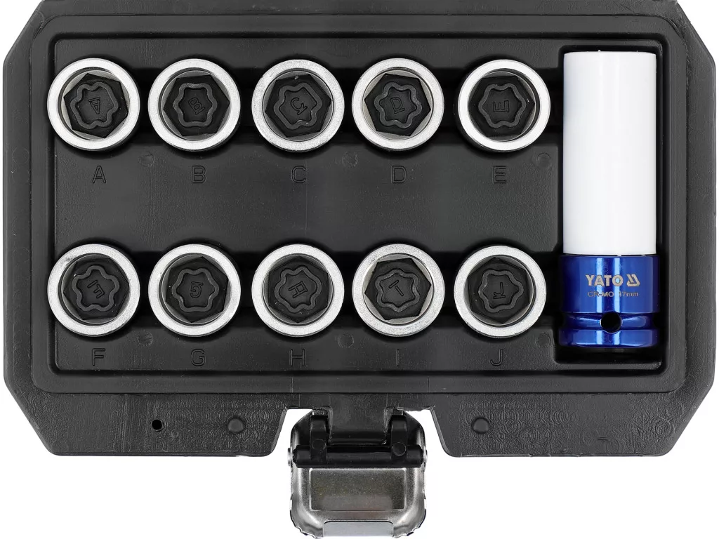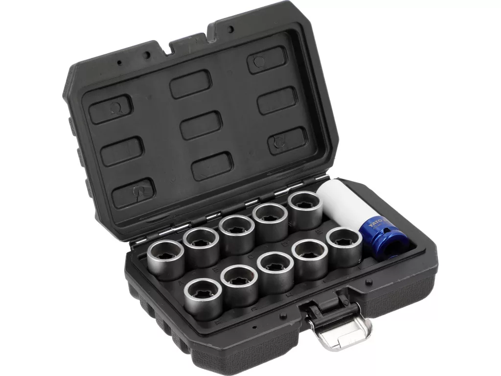 Toyota autók csavarjainak rögzítéséhez készült kulcsfej készlet, amelyet kimondottan azok számára terveztek, akik a csavarozási feladatokat megbízható, hosszú távú teljesítménnyel szeretnék elvégezni. A készlet 11 darabot tartalmaz, ebből 10 darab hagyományos socket, és egy 17 mm-es ütőfejes socket. A készlethez tartozó hajtó tengely mérete 1/2" (12,7 mm), amely kompatibilis a 1/2" négyzetes hajtókkal és ütőkalapácsokkal egyaránt.