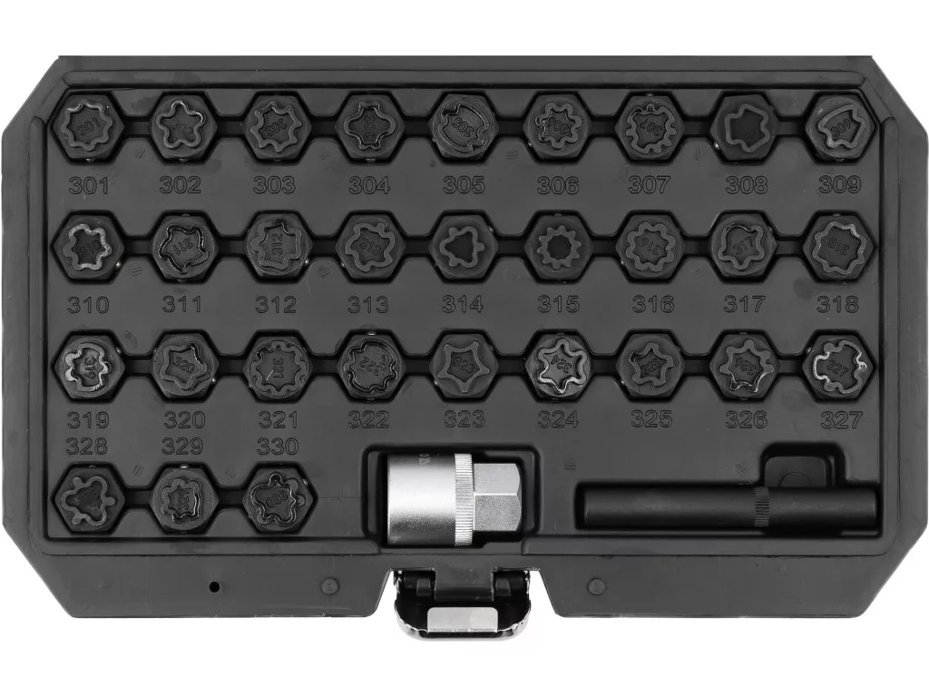 Mercedes csavarbiztosító készlet: 30 darab tartozék, kulcsadapter és tolófej. Fogantyú mérete: 1/2" (12,7 mm). CrMo acélból készült, oxidált felülettel.