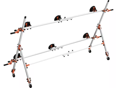 Ez a stabil és sokoldalú szállítási és kezelési rendszer nagyformátumú lemezek biztonságos és stabil kezelésére szolgál, mind a szállítás, mind a telepítési helyen történő anyaglehelyezés során. A konstrukció alapja két alumínium ötvözetből készült vezető sín, amelyek hosszát 160–360 cm között lehet állítani. A rendszerhez hat darab, 20 cm átmérőjű vákuumszívó csapot rögzítettünk, amelyek rögzítési pontjai a felület formája szerint pontosan állíthatók, így biztosítva a nagyobb méretű anyagoknál is a kiváló teherbírást és a munkahelyi megbízhatóságot.