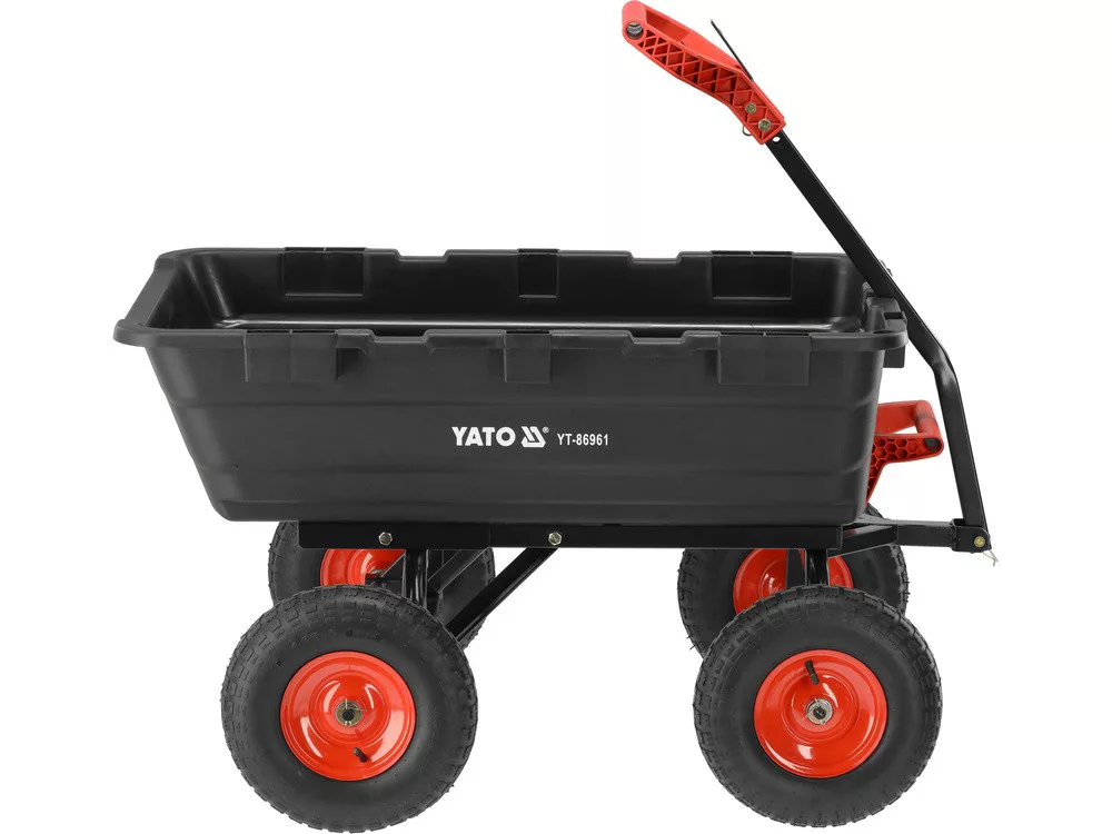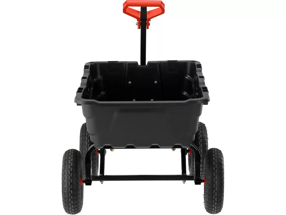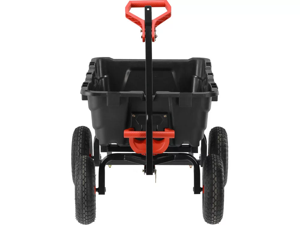 Kerti kocsi, billenő funkcióval, megerősített konstrukció, nagy, felfújható kerekekkel.