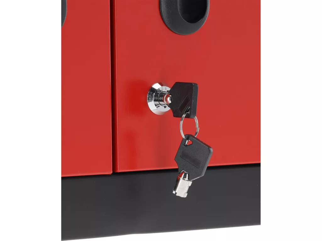 Szilárd fali szekrény 0.8 mm vastag porfestett acéllemezből; korrózió- és kopásálló. Méretek: 660 × 305 × 712 mm, tömeg 15 kg. Dupla ajtó zárható, 2 kulcs található.