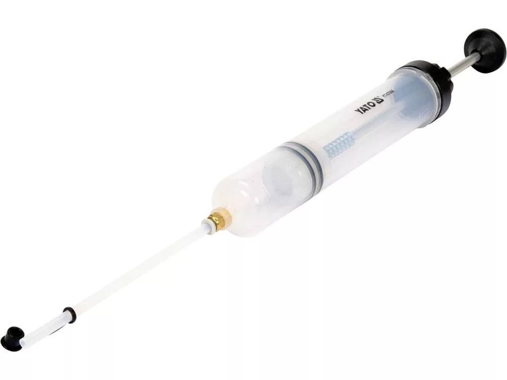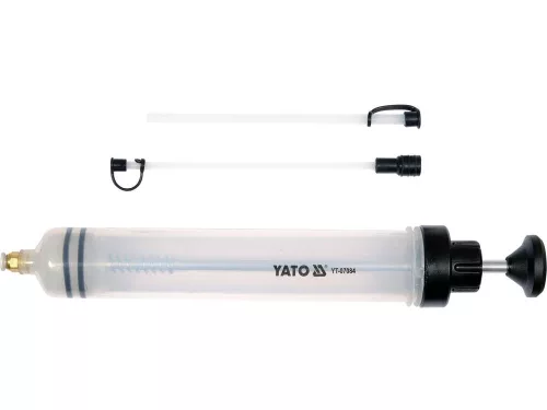 Kézi fecskendő 500 ml-es, üzemi folyadékok, például motor- és sebességváltó-olaj, hűtő- és fékfolyadék hozzáadására vagy szívására géptartályokból.