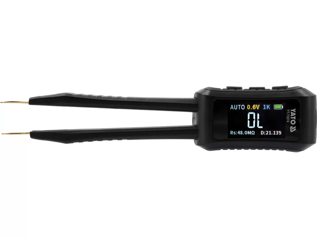 Csipesz-formájú pontos teszter SMD és lyukasztott alkatrészekhez; OLED kijelző, automatikus felismerés, ESR, disszipáció, Q-érték mérése; kompakt Li-Po 3,7 V, USB-C, ABS ház.