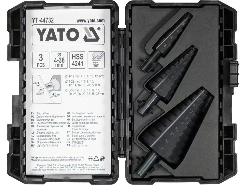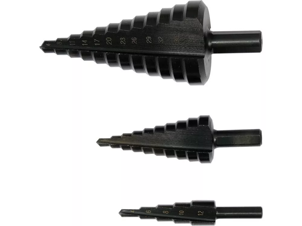 Lépcsősfúró készlet 3 részes, kiváló minőségű rozsdamentes acél, szerkezeti acél, hidegen hengerelt acél, színesfémek, acéllemezek és műanyagok fúrásához.