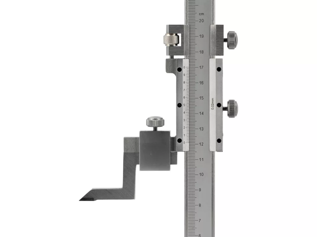Magasságmérő, tartomány: 0–200 mm vagy 0–500 mm indextől függ; Pontosság: ±0,02 mm (±0,001"); felbontás: 0,01 mm (0,0005"); olvasat hagyományos metrikus és hüvelykes skálával; test rozsdamentes acélból készült, ütésálló és deformációálló; 5–40°C.