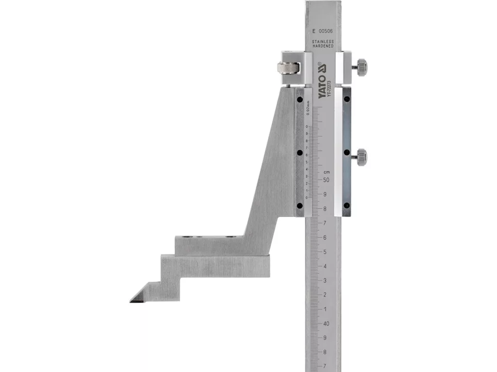 Magasságmérő 0–200/0–500 mm tartománnyal, pontosság ±0,02 mm, olvasás 0,01 mm, méter- és hüvelyk-skálázással; rozsdamentes acél, 5–40 °C.