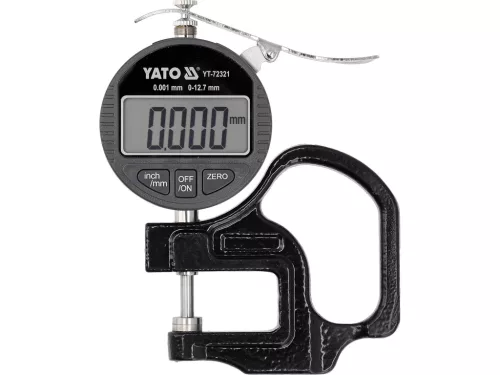 Elektronikus vastagságmérő, pontosság ±0,001 mm, mérési tartomány 0–12,7 mm, felbontás 0,001 mm (0,00005"), LCD kijelző, metrikus/colos egységváltás, bekapcsolás/kikapcsolás, nullázás. Fogónyílás 30 mm, működés 5–40°C, tárolás -20–60°C. LR44 1,5 V, 150 mAh, hordtáska.