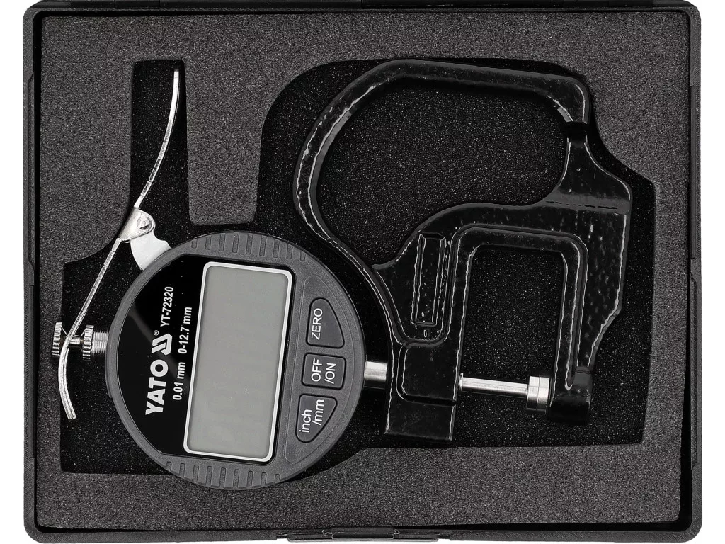 Elektronikus vastagságmérő, tartomány 0–12.7 mm, pontosság ±0.01 mm (±0.0005"), felbontás 0.01 mm (0.0005"), LCD kijelző, markolati mélység 30 mm, üzemelési hőmérséklet 5–40°C, tárolás -20–60°C, LR44, 1.5 V, 150 mAh, mm/inch, on/off, zeroing, hordtáska.