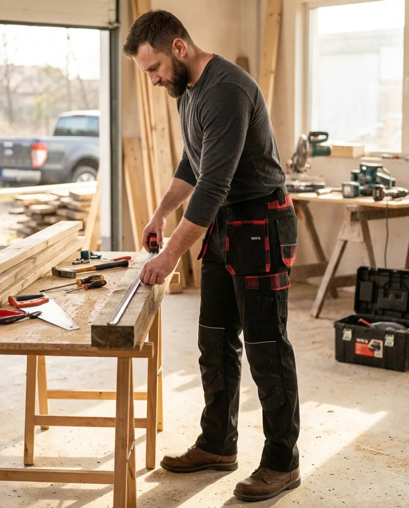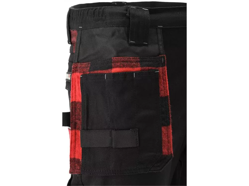 A jobb lábon két keskeny zseb található, pl. egy késnek és egy fa vonalzónak, valamint egy hurok a kalapácsnak