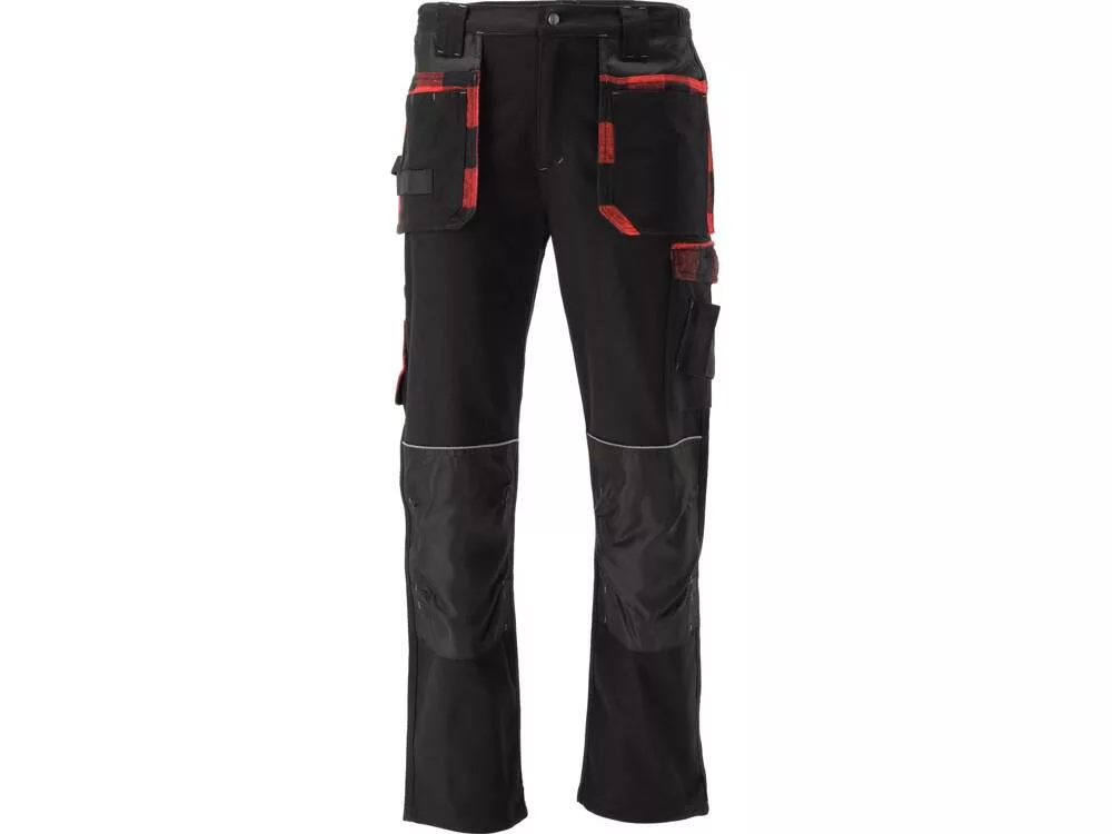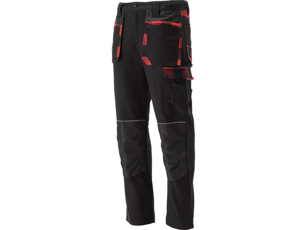 Elasztánból készült munkanadrág tizennégy zsebbel, ebből kettő tépőzáras és egy patentos.