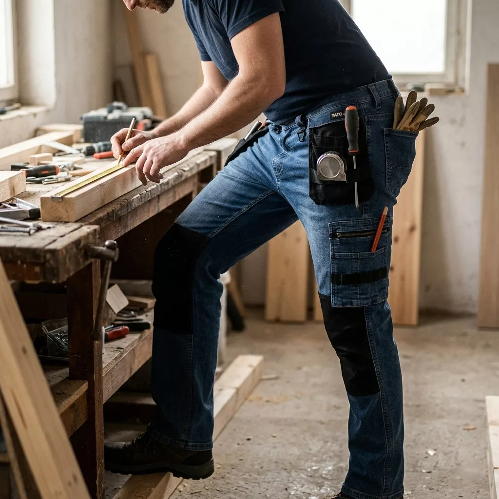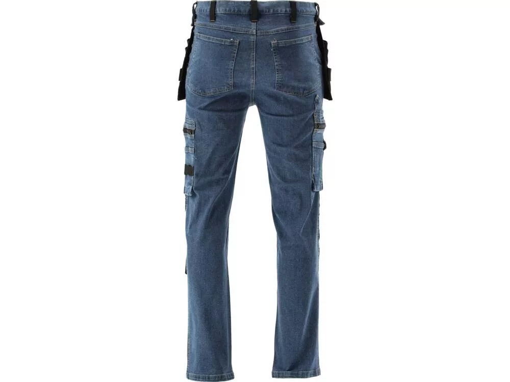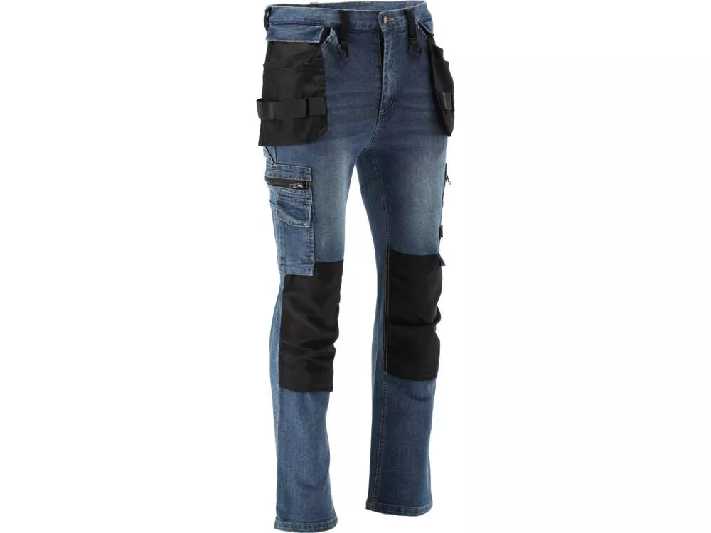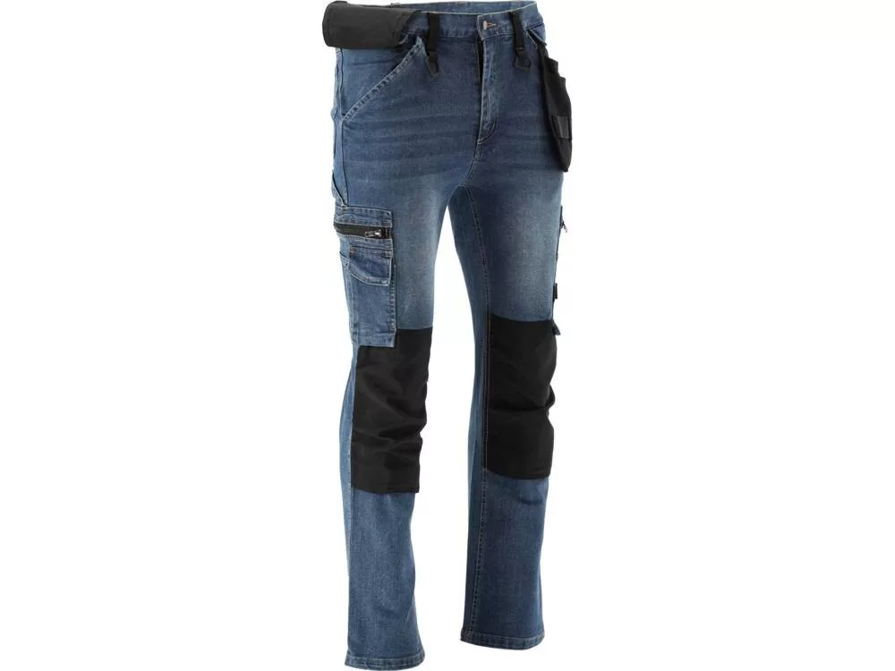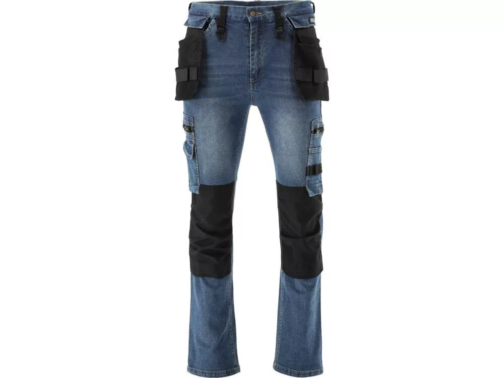 Munkanadrág elasztánnal, kopott és rugalmas farmerből. Akár tizenhét zseb, köztük egy tépőzáras, kettő cipzárral Zárható és két levehető fitting zseb.