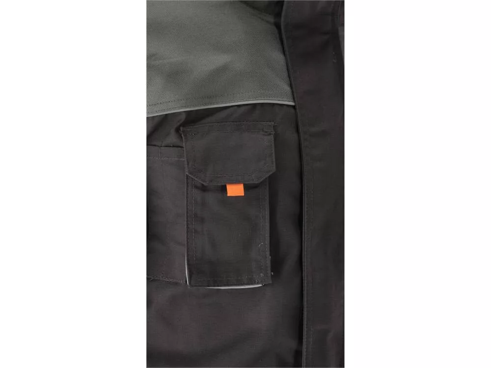 Munkavédelmi kabát nyolc zsebbel, szellőzővel a karok alatt és számos további, kopásálló anyagból készült díszítéssel a sérüléseknek leginkább kitett helyeken.