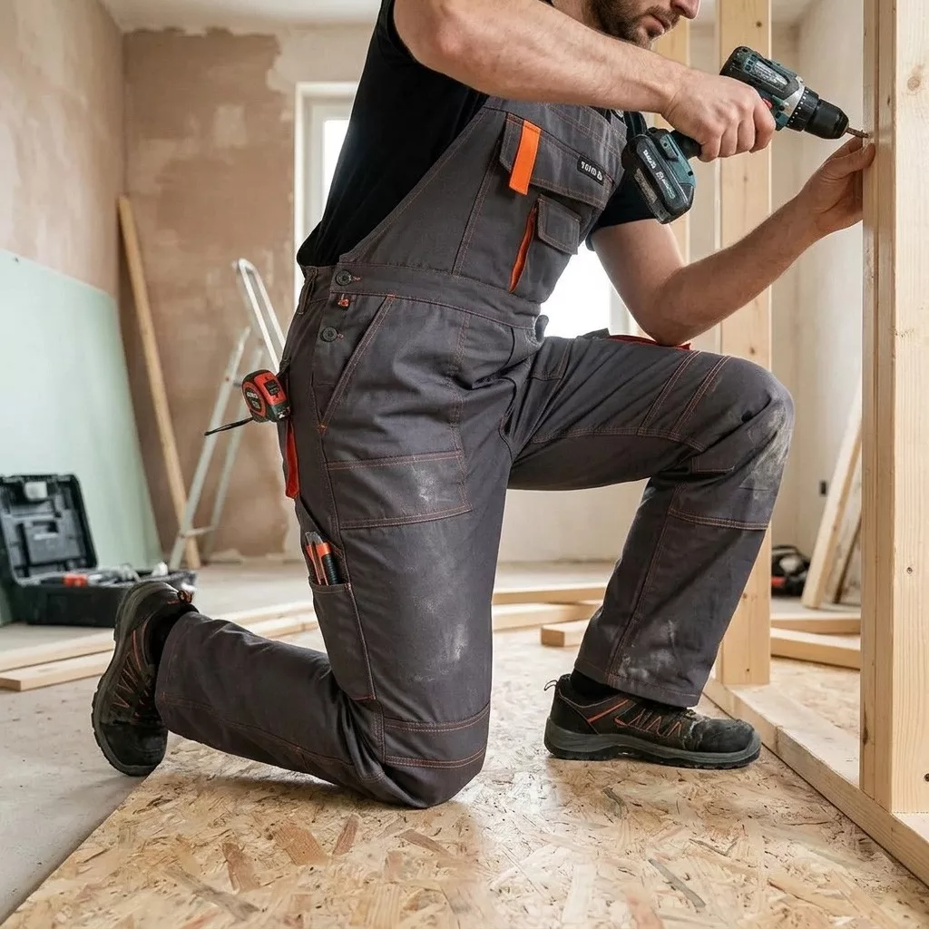 Hámos munkásnadrág hét zsebbel, amelyek közül négy tépőzárral záródik, és speciális zsebekkel a térdvédők számára.