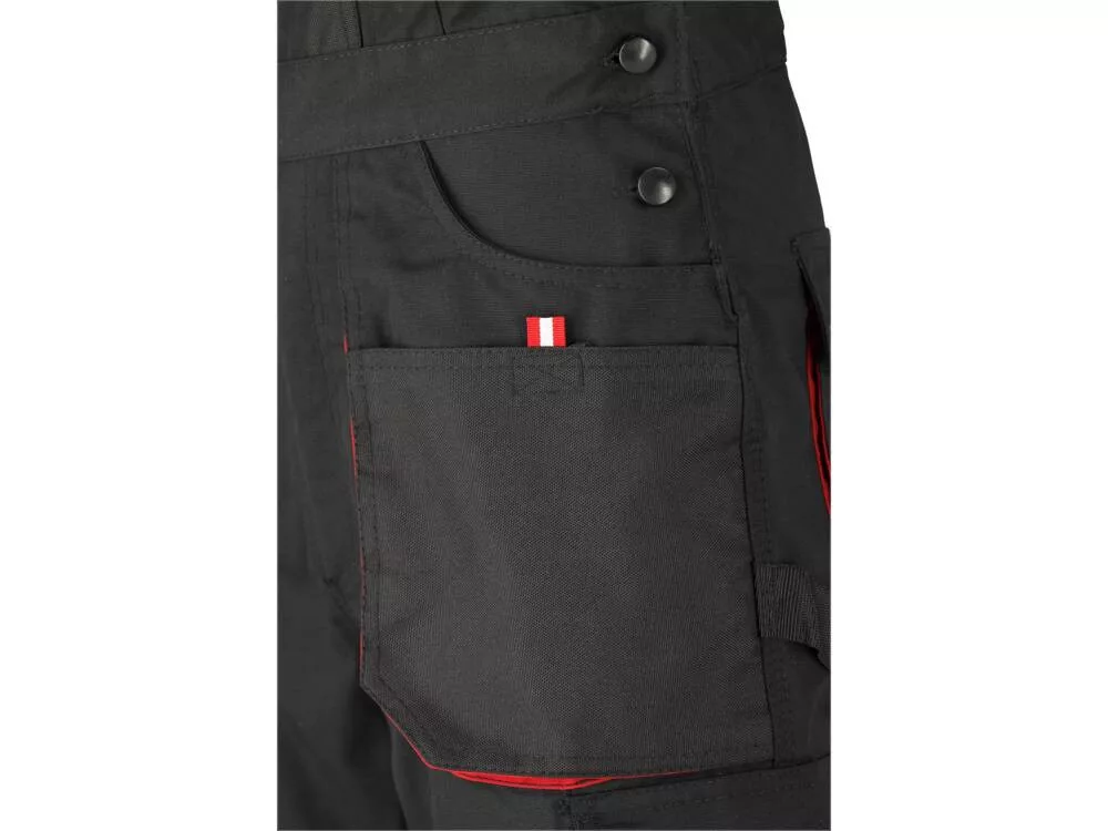 Munkanadrág tizenegy zsebbel, amelyek közül hét tépőzárral zárható, és speciális zsebekkel a térdvédők számára.