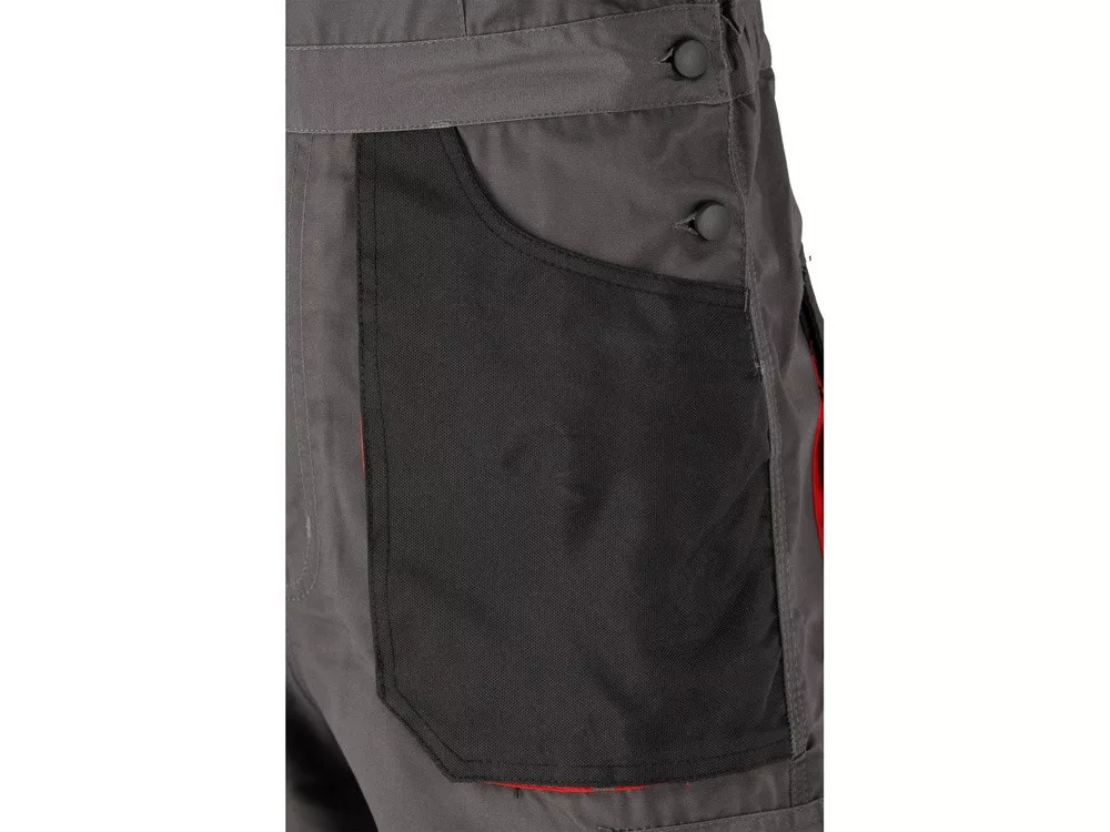 Kantáros overall hét zsebbel, köztük öt tépőzáras zsebbel és speciális zsebekkel a térdvédők számára.