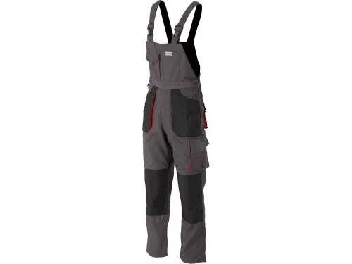 Kantáros overall hét zsebbel, köztük öt tépőzáras zsebbel és speciális zsebekkel a térdvédők számára.