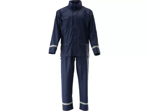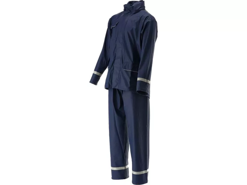 Munkavédelmi szett, három zsebes kabát állítható kapucnival, nadrág gumírozott derékpánttal, kék színű, XXL -es méret.
