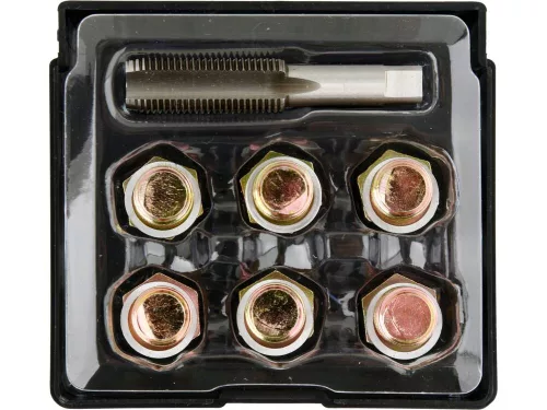 Olajleeresztő csavar menetjavító készlet 7 részes, illeszkedik a személygépkocsikban és könnyű tehergépkocsikban általánosan használt legtöbb menethez.
