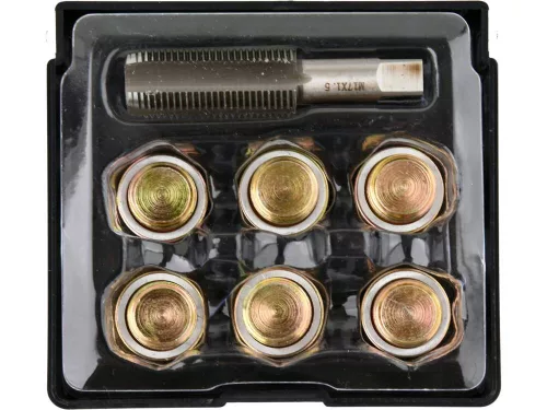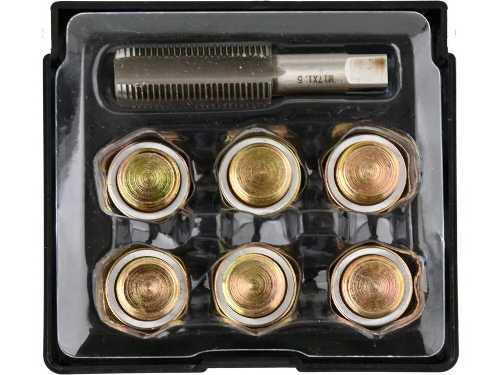 Olajleeresztő csavar menetjavító készlet 7 részes, illeszkedik a személygépkocsikban és könnyű tehergépkocsikban általánosan használt legtöbb menethez.